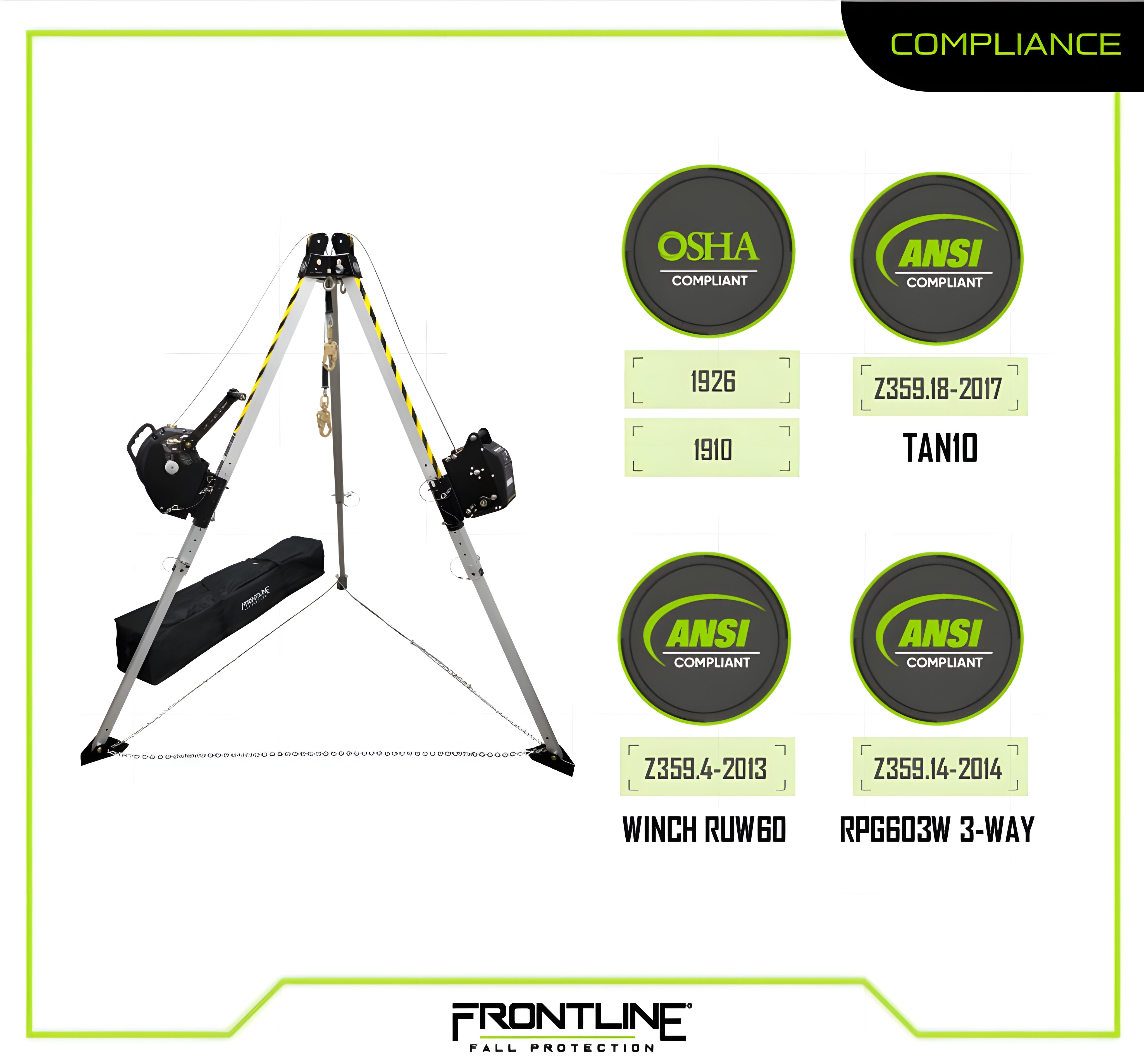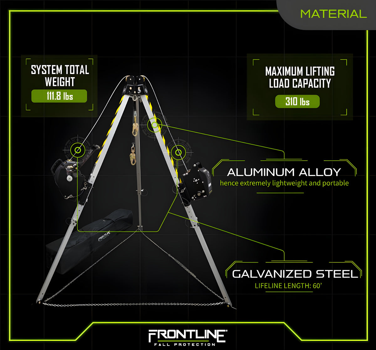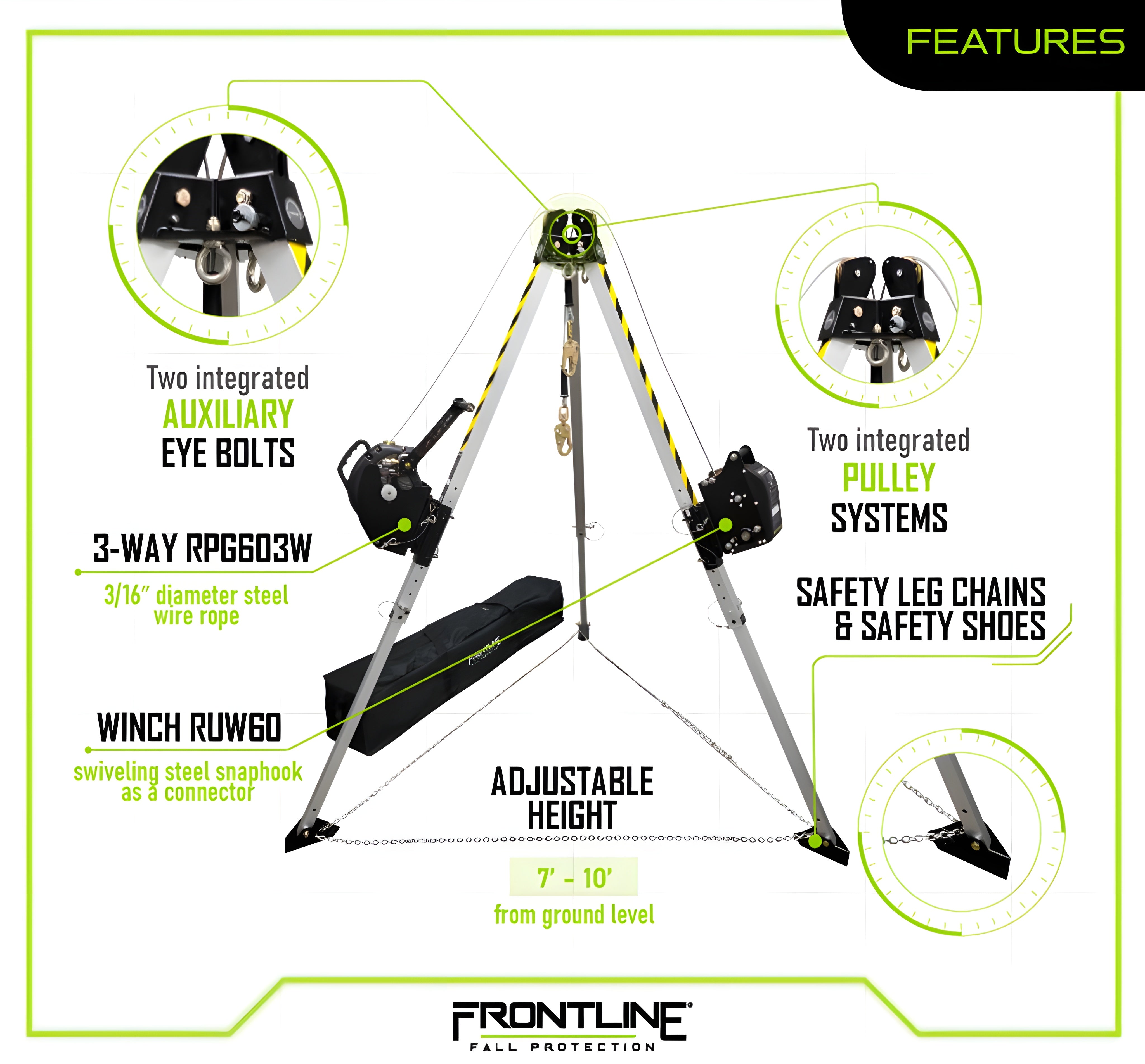 The Frontline MEGApod TAN10RURP Confined Space Tripod System delivers a reliable and portable solution for safe entry, rescue, and retrieval operations in confined space environments. Constructed from lightweight yet durable aluminum, the tripod can be quickly set up by a single user without the need for tools, while its rugged design ensures dependable performance on demanding worksites.