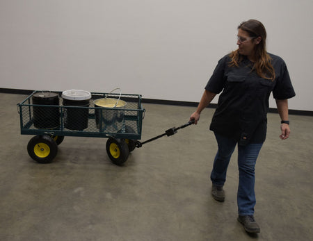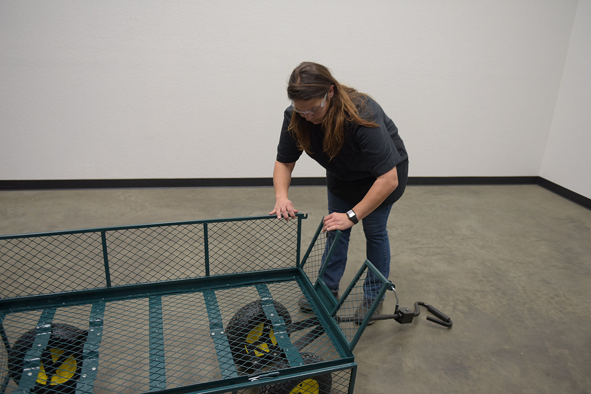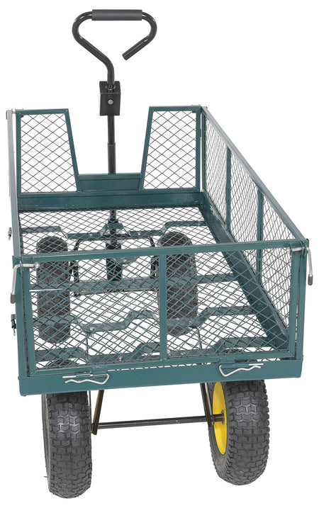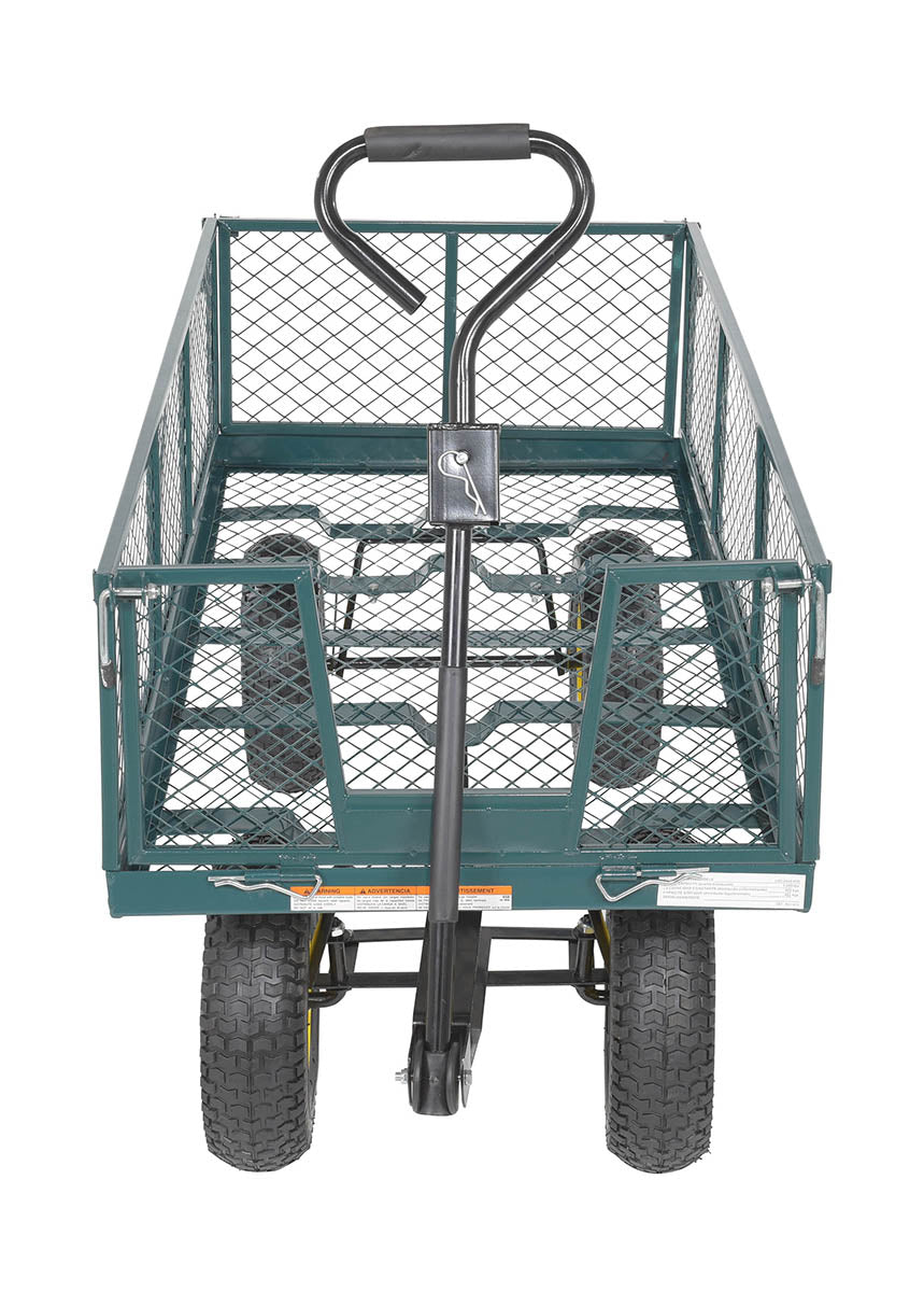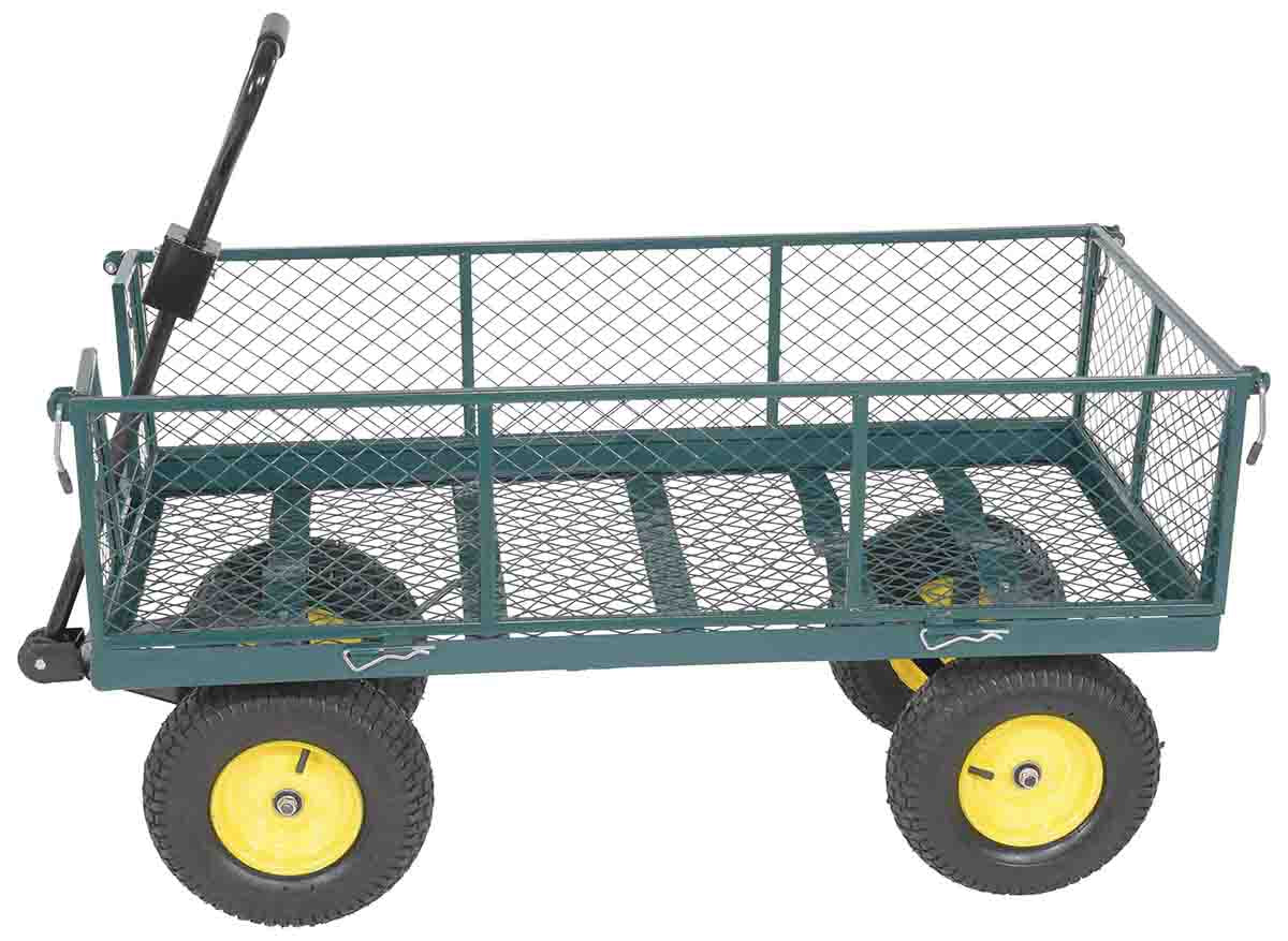 Four large pneumatic tires provide smooth maneuverability across uneven ground, and fold-down sides make loading and unloading quick and efficient. A built-in tow coupler comes standard for easy transport.