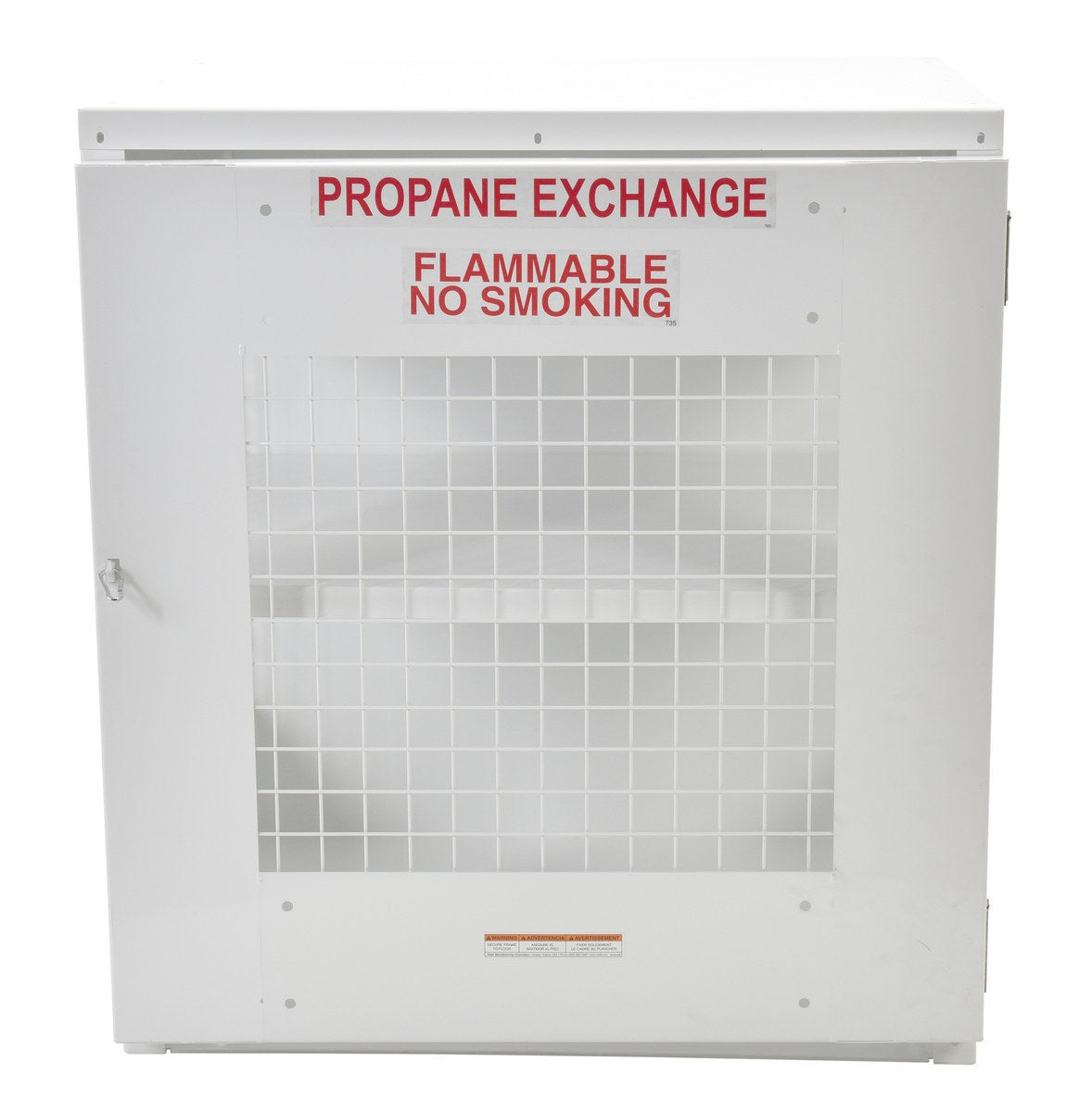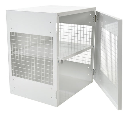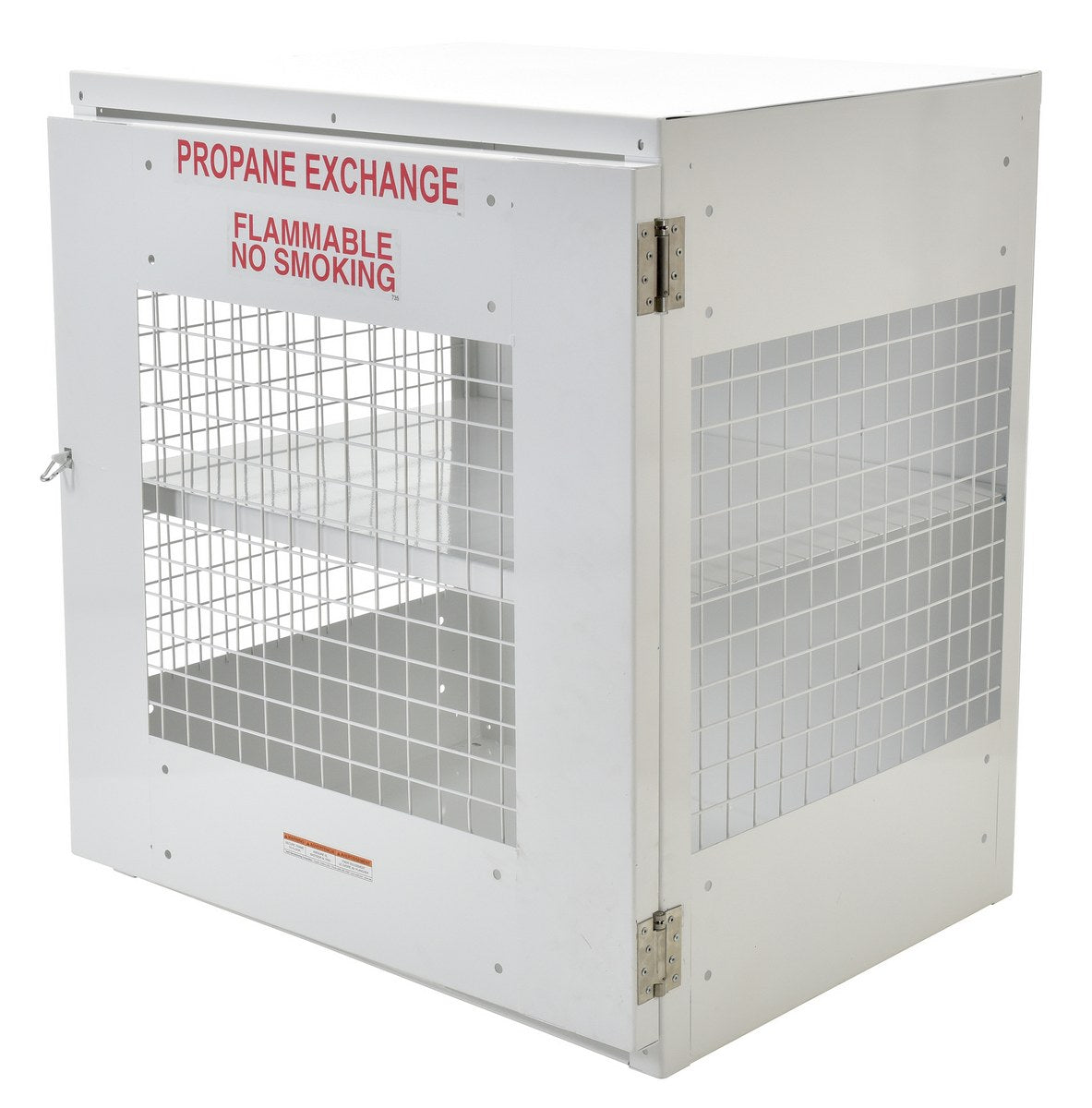The Vestil CYL-EX-12-E Steel Propane Exchange Cylinder Storage Cabinet provides safe, OSHA-compliant storage for propane gas cylinders. Built with expanded steel mesh sides and door for visibility and ventilation, along with solid steel top, back, and bottom panels for strength. The front door is equipped with stainless-steel spring-loaded hinges that resist rust over time. The lockable door (padlock not included) ensures security while signage alerts to hazards.