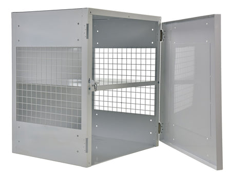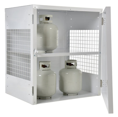 The Vestil CYL-EX-12-S Steel Propane Exchange Cylinder Storage Cabinet provides secure, OSHA-compliant storage for standard propane cylinders. Built with expanded steel mesh sides for ventilation and visibility, along with solid sheet steel top, back, bottom, and front door for added protection. The stainless-steel spring-loaded hinges resist rusting and ensure long-lasting performance. A lockable hinged door (padlock not included) secures cylinders while required hazard signage alerts to propane safety risks.