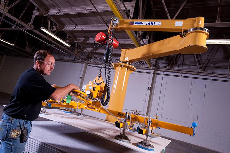 Spanco's articulating jib cranes can lift loads around corners and columns, reach into or under machinery and containers, and service virtually any point between the pivot anchor and the far reach of the boom.