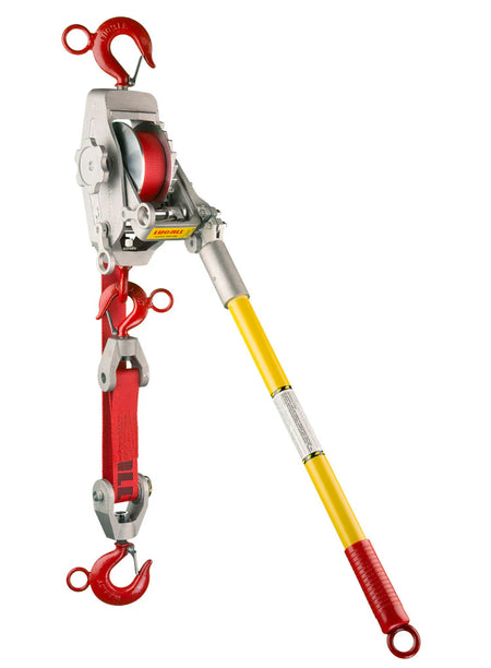 The Lug-All 4-B is an industrial-grade 2 ton web strap hoist designed for safe, reliable lifting and pulling in utility, construction, and maintenance applications. This model is equipped with hot stick rings, making it especially well suited for electrical lineman work and energized environments.