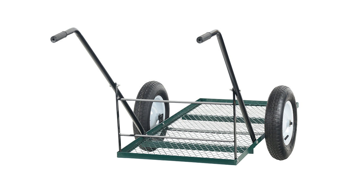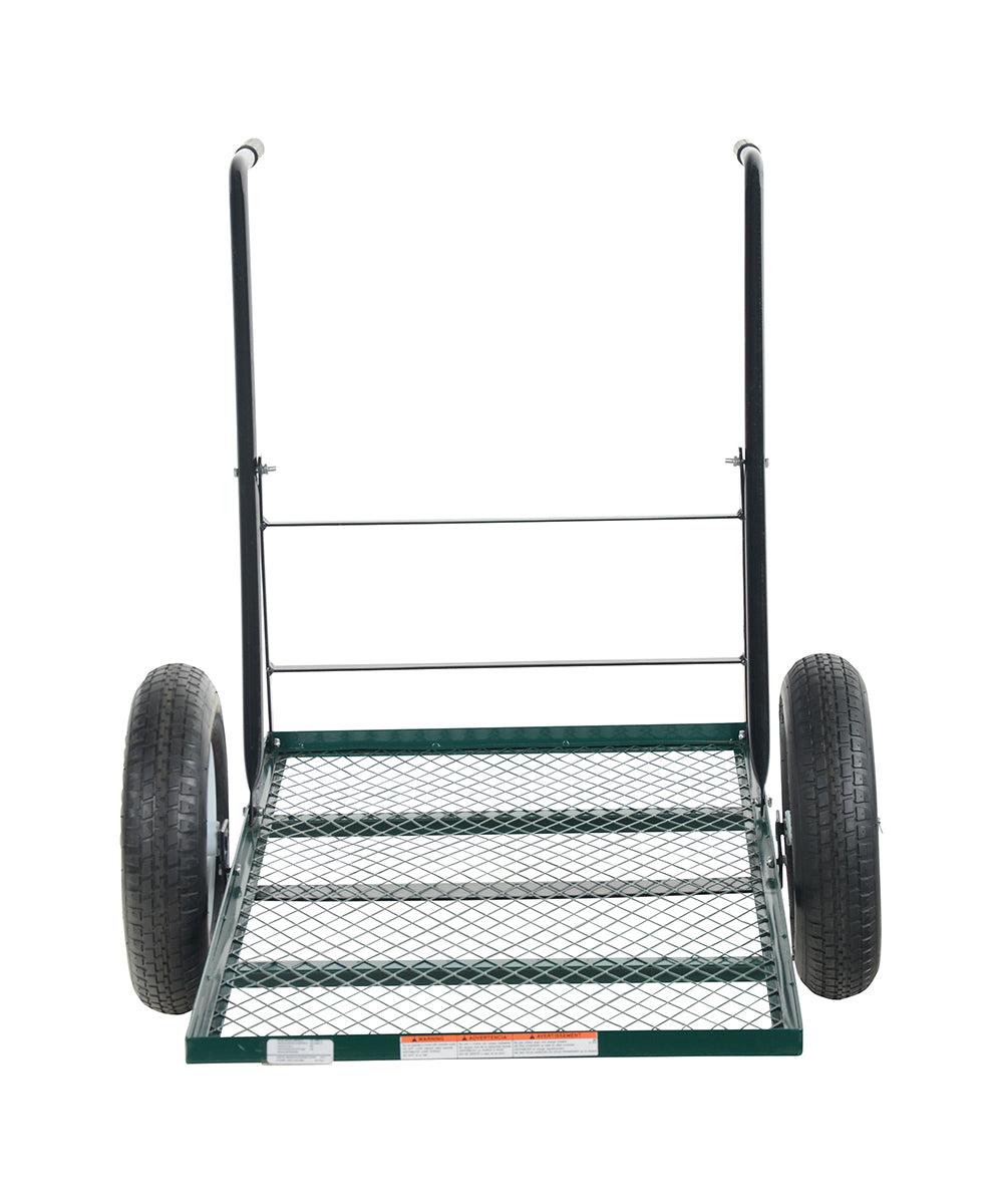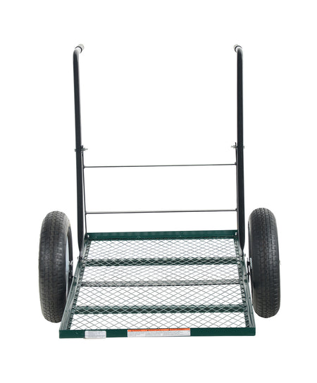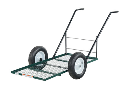 Large pneumatic tires provide stability and smooth maneuverability over rough terrain, while the rugged steel frame ensures years of reliable outdoor use.