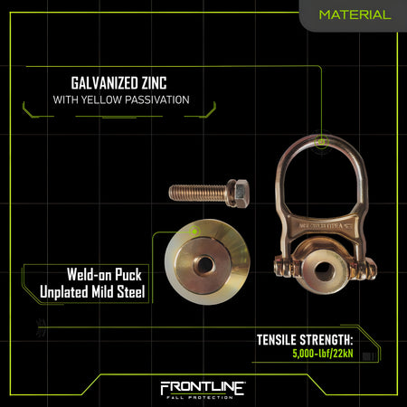 Constructed from galvanized zinc with yellow passivation for enhanced corrosion resistance, the ALPHA anchor performs reliably in both indoor and outdoor environments. It is ideal for single-user anchoring or as part of a temporary horizontal lifeline system. The reusable design includes a weld-on mounting puck that can be replaced for use on different work areas, providing long-lasting versatility and safety on the job.