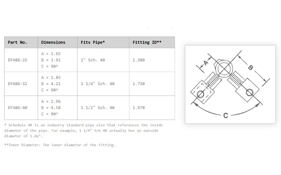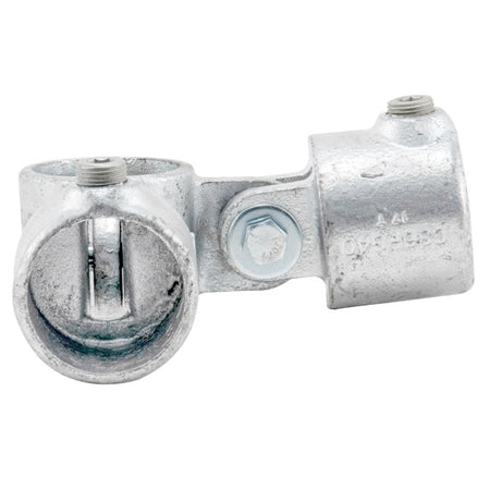 The Easyfit 90 Degree Corner Swivel Kit (EF48G) includes two EF36G Single Female Swivel fittings and one EF38G 90 Degree Corner Male Swivel, assembled with steel bolts, nuts, and washers. This fitting creates a flexible 90-degree angled joint at a post, ideal for connecting mid-rails to uprights on sloped or irregular handrail installations and for adding corner bracing to structural pipe systems.