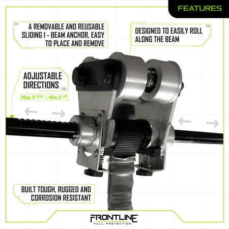 The Frontline ST10HTK Beam Trolley Anchor offers unmatched trailing mobility with its high-speed aluminum roller system, designed to follow the user along the I-beam for optimal safety and productivity. Lightweight and durable, this reusable anchor installs easily and adjusts to fit I-beam flanges from 3" to 10" wide.