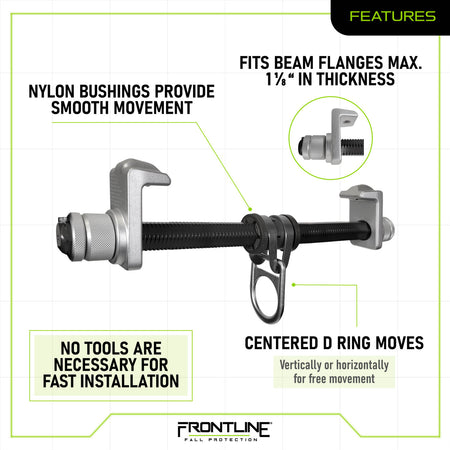 The Frontline Aluminum I-Beam Slider Anchor is a portable, efficient anchoring solution for horizontal I-beam applications. Designed for quick setup and removal, this anchor features nylon bushings and ball bearings that allow it to glide smoothly along beam flanges, trailing the worker to provide continuous protection and productivity.