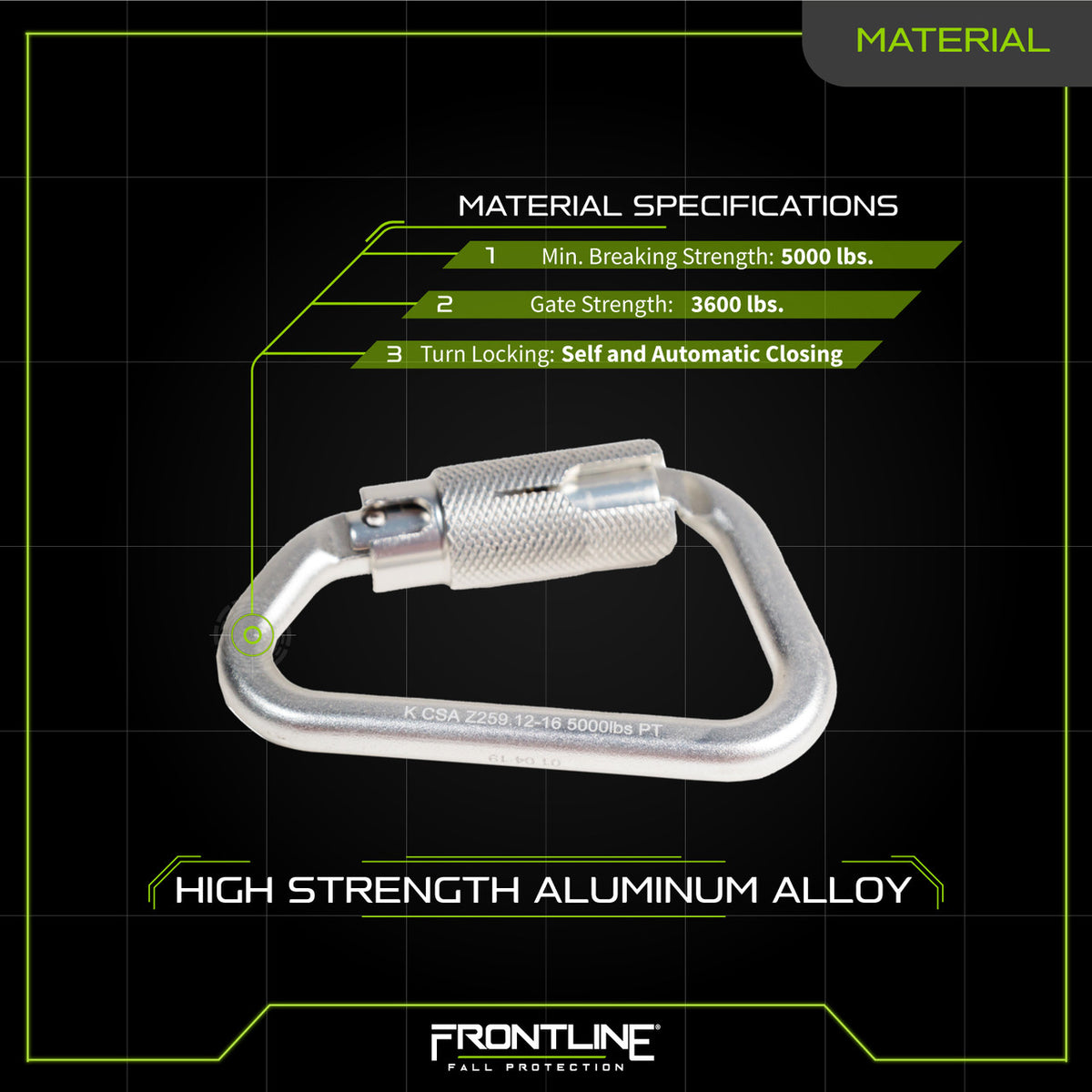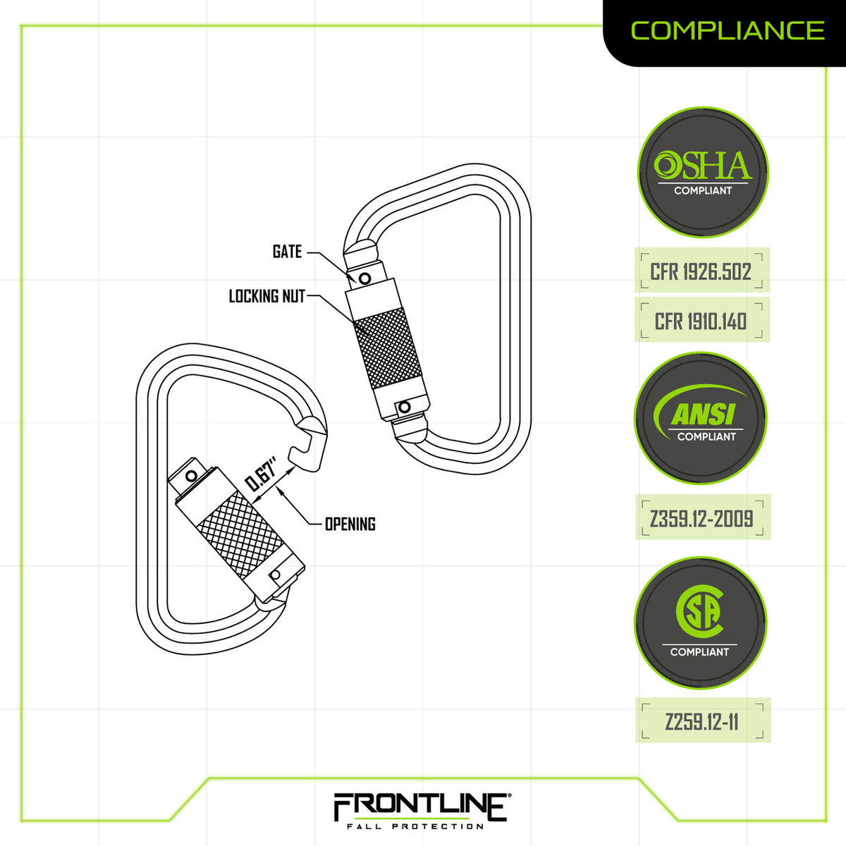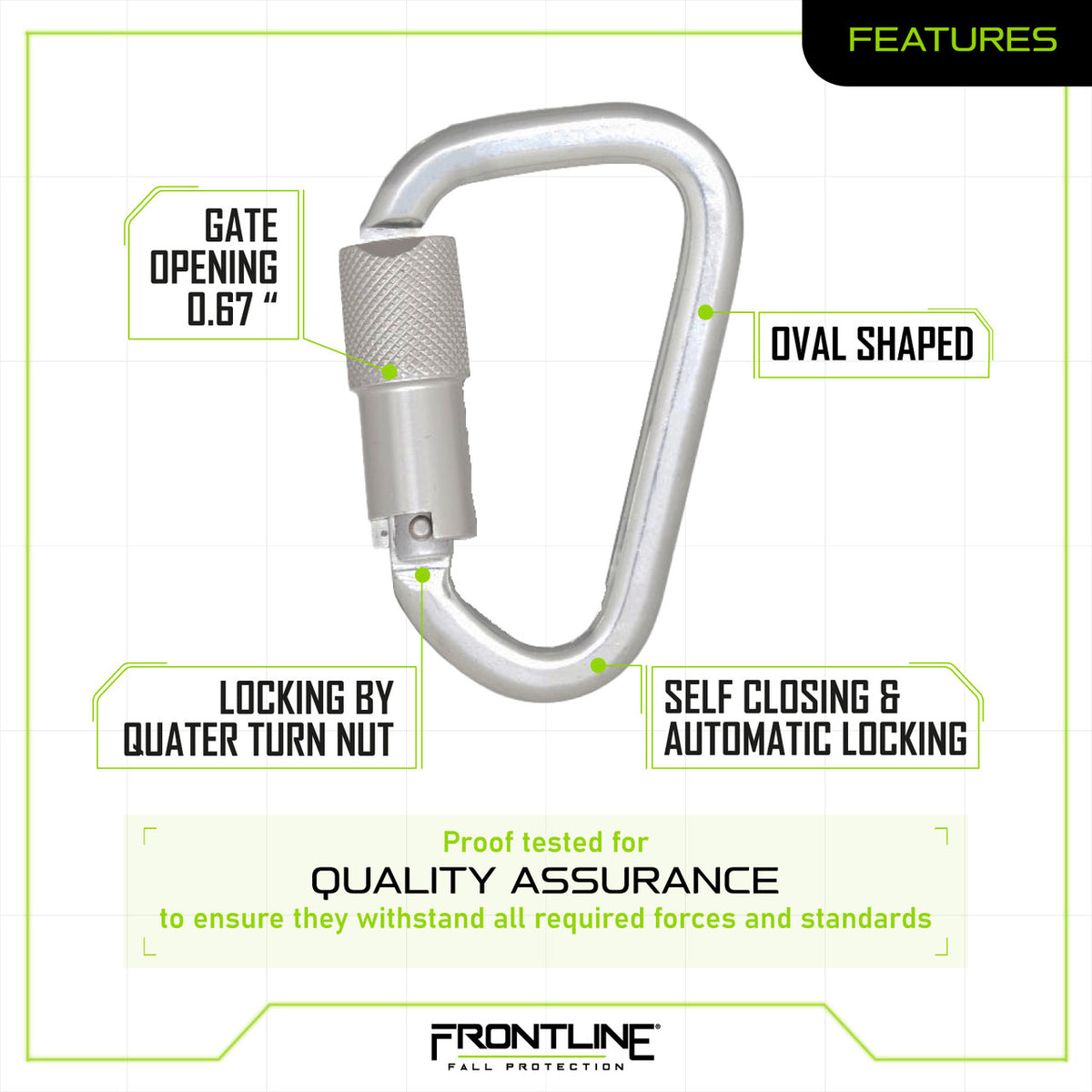 The Frontline CAQ117 Aluminum Quarter Turn Locking Carabiner is a lightweight yet high-strength connector designed to perform in demanding environments. Constructed from durable aluminum alloy, this carabiner is ideal for connecting self-retracting lifelines (SRLs), lanyards, or anchorage systems.