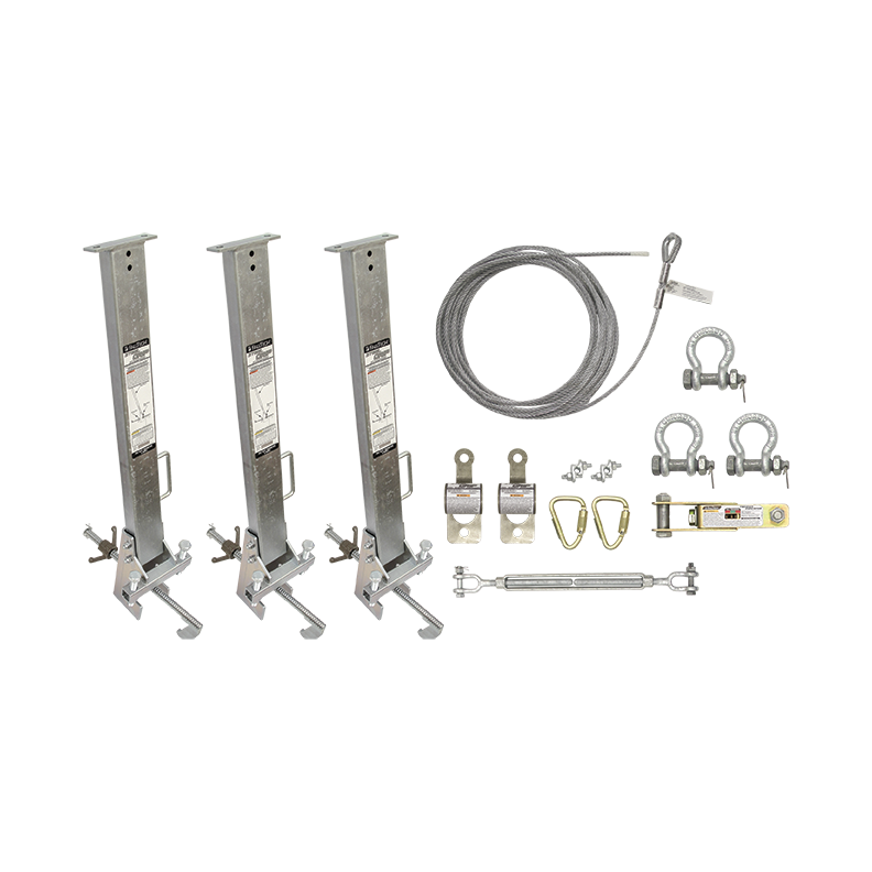Kit includes horizontal lifeline, shock absorber, tensioner, carabiners, stanchions & mounting brackets