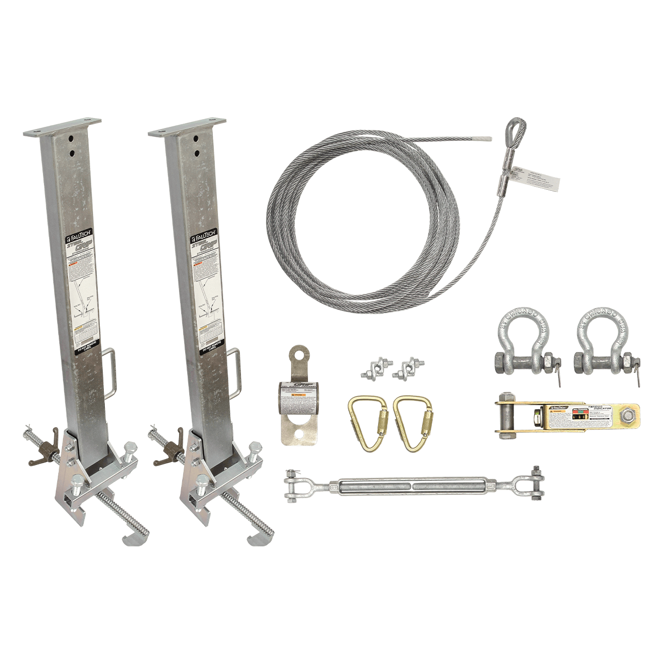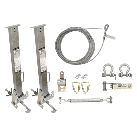 Kit includes horizontal lifeline, shock absorber, tensioner, carabiners, stanchions & mounting brackets