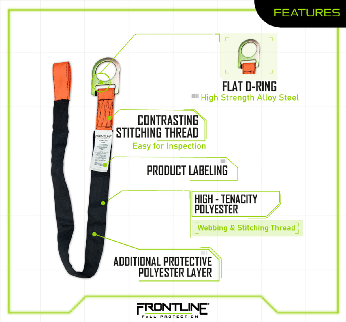 Constructed from high-visibility safety orange webbing with contrasting stitching for easy inspection, this strap features a durable D-ring for quick attachment of lanyards or SRLs. A protective polyester sleeve adds resistance against abrasion, ensuring longer service life on the jobsite.