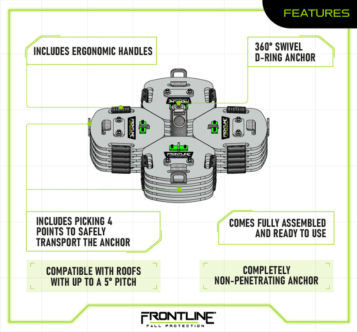 The Frontline CO2NN Counterweight Anchor System is a non-penetrating solution designed for rooftop and elevated work areas where substrate integrity must be preserved. Ideal for fall arrest or restraint applications, this system supports a single user without requiring drilling or permanent attachment—making it perfect for use on finished roofs or delicate surfaces.