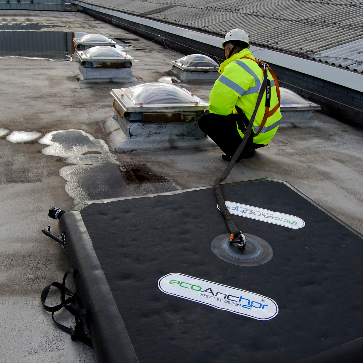 Its natural rubber-based construction enhances surface friction, allowing it to remain securely in place without tools or permanent installation. Ideal for use on finished surfaces or sensitive substrates, the EcoAnchor is perfect for temporary tie-off points or as part of a horizontal lifeline system when used in pairs.