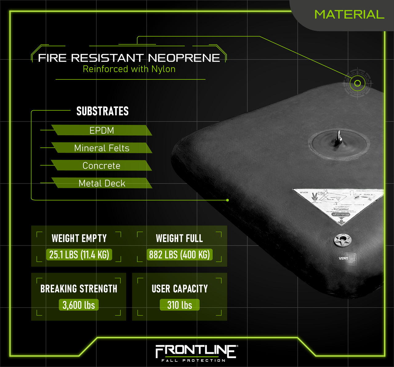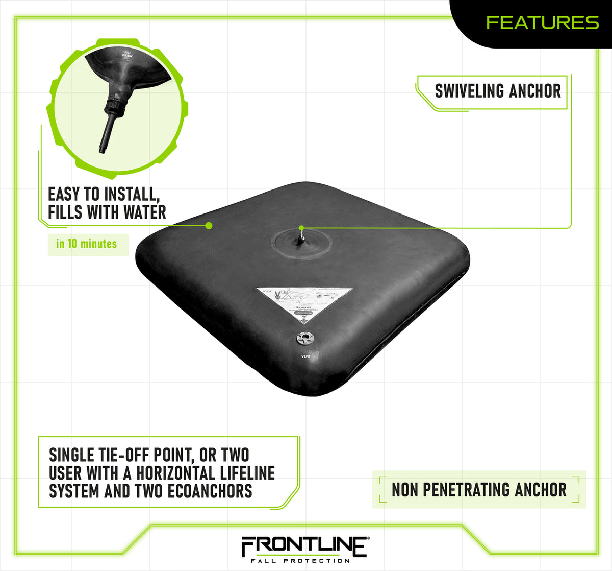 The Frontline EcoAnchor is a revolutionary counterweight fall arrest anchor system that utilizes water as ballast, offering a reusable, non-penetrating solution for fall protection. Made from fire-resistant neoprene reinforced with nylon, this anchor is lightweight when empty for easy transport and fills with water in just 10 minutes, reaching a total weight of 882 lbs.