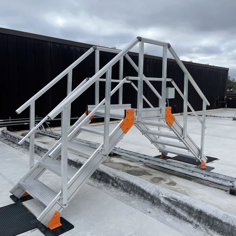 The KC103 Crossover Stair System allows for safe access over pipes, expansion joints, and equipment or up to elevated areas. KC103 Crossover Stair Systems are manufactured of high tensile strength aluminum, in stock and ready to ship, made in the USA, and meet OSHA and ANSI standards. The KC103 Crossover Stair System is available as standard in a 3ft wide configuration with a 36in long platform. KC103 Crossover Stair Systems are supplied in modules that simply bolt together in the field. The modular design allows for adjustment in the field as and when needed.