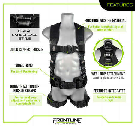 The 110CTB-DC Combat™ Full Body Harness from Frontline blends top-tier safety performance with bold digital camouflage aesthetics. Featuring all-aluminum hardware, this lightweight harness is built to withstand tough environments while delivering maximum comfort and mobility.
