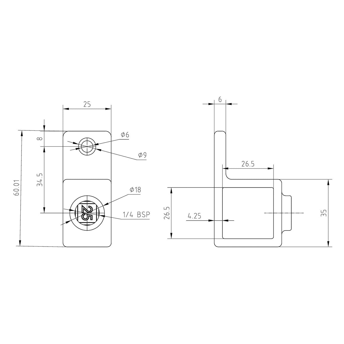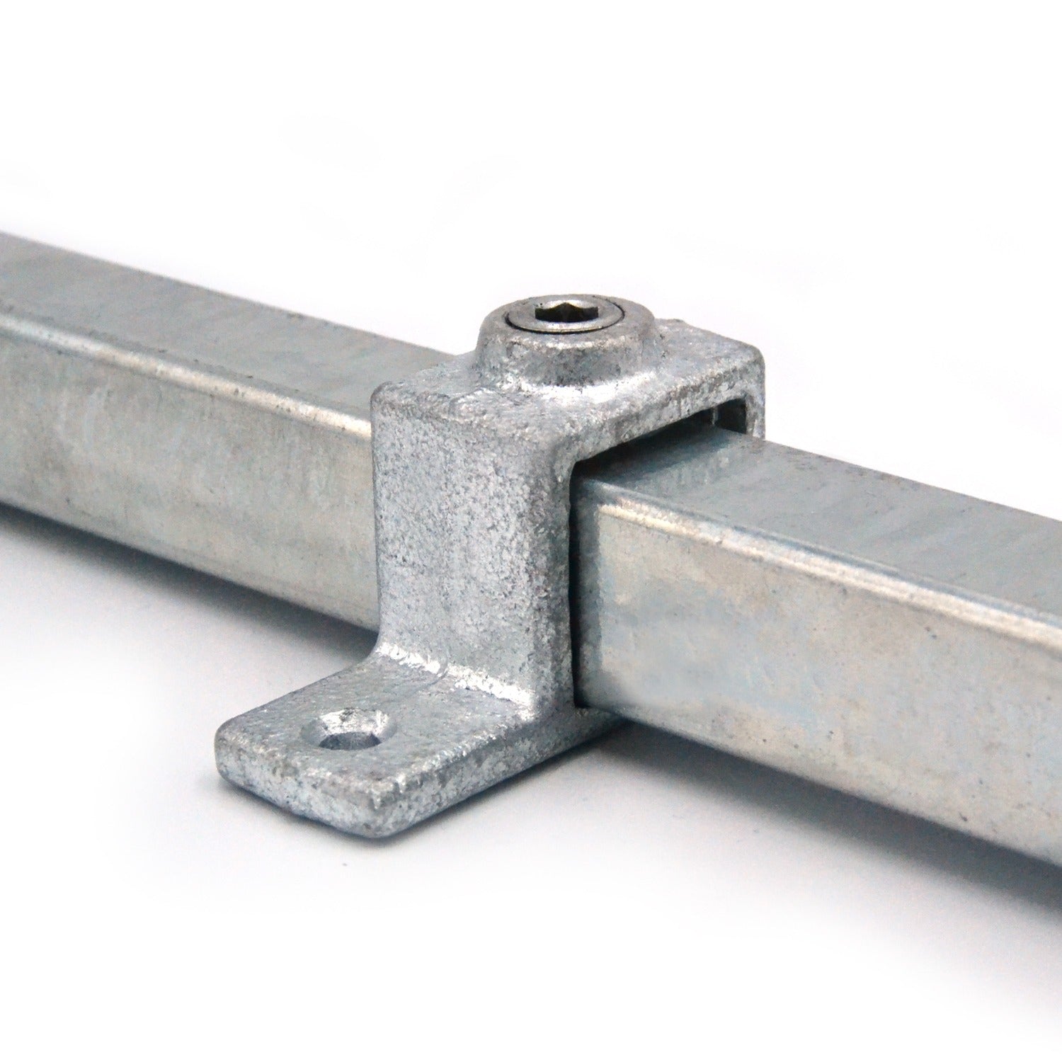This fitting is compatible with 25 mm or 40 mm galvanized square tubing with a 2 mm wall thickness and installs easily using a standard allen wrench and one 1/4" diameter mounting fastener.
