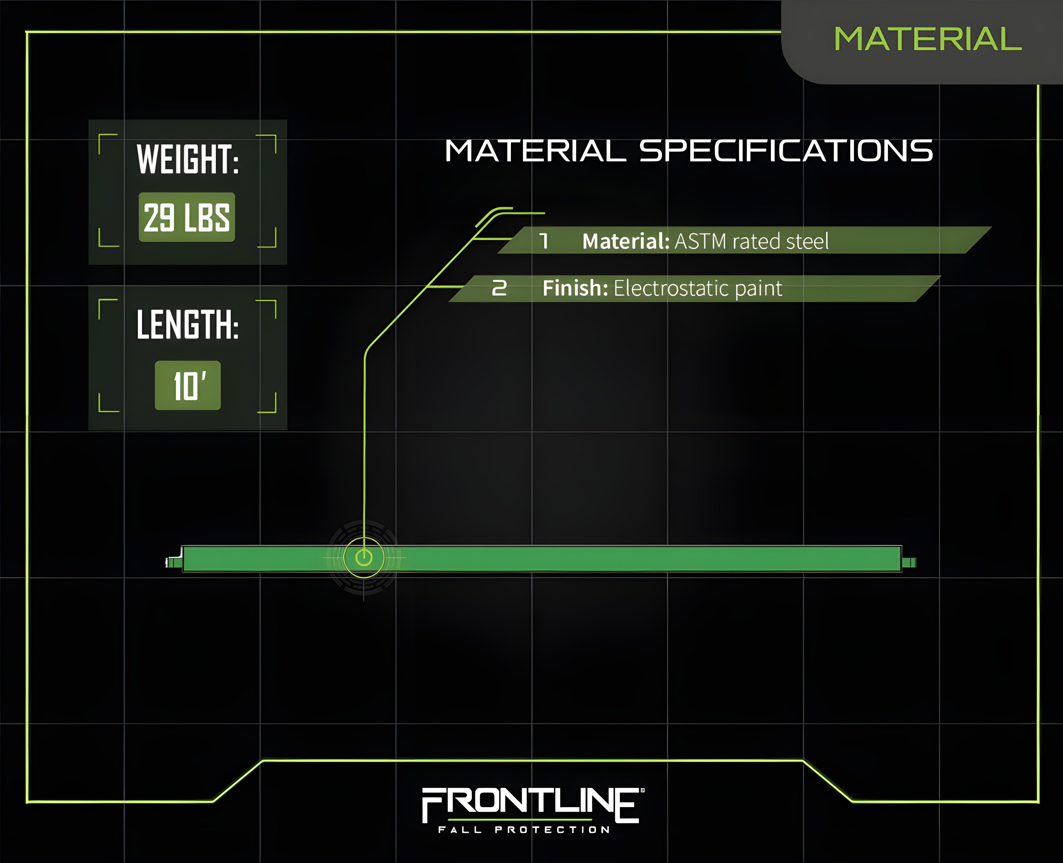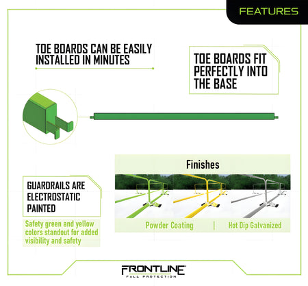 A simple, drop-in safeguard for open-edge guardrail runs, the GUTO 10-ft Toe Board keeps hand tools, fasteners, and debris from sliding off roofs, decks, or mezzanines and striking people below. Each section is formed from high-strength, ASTM-rated steel and finished in your choice of safety yellow, powder coated, or hot-dip-galvanized (HDG) electrostatic paint for long-lasting corrosion resistance and job-site visibility. A built-in retention clip slides directly into Frontline GUS10 guardrail bases, locking snugly in seconds—no drilling, hardware, or loose brackets to track. Installers can ring an entire perimeter in minutes, then pull the boards just as quickly when it’s time to move on.