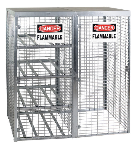 The cabinet includes two hinged doors with a padlock hasp (padlock not included), a DANGER FLAMMABLE MATERIALS sign, and all required hardware. Its galvanized finish provides rust resistance for outdoor use. The cabinet meets OSHA 1910.110, NFPA 55 and 58, and CGA P-1 requirements.