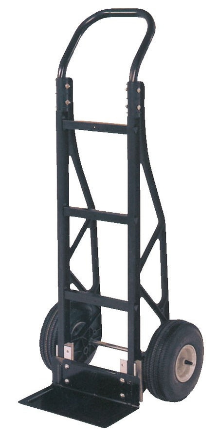 Transport lightweight loads with this Fiber/Nylon Hand Truck. The unique construction is stronger than steel, yet lighter and more cost effective than aluminum. The 10" x 3-1/2" pneumatic wheels provide a smooth ride and years of durability. Uniform static capacity is 500 pounds.