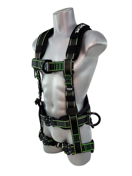 Designed with safety and convenience in mind, the harness includes aluminum quick-connect buckles on all major strap points, lanyard keepers on each shoulder to prevent tripping hazards, and dual loops for tool tethering or accessory attachment. With high-tenacity black polyester webbing and high-visibility green stitching, inspections are quick and easy.