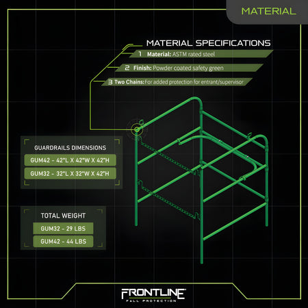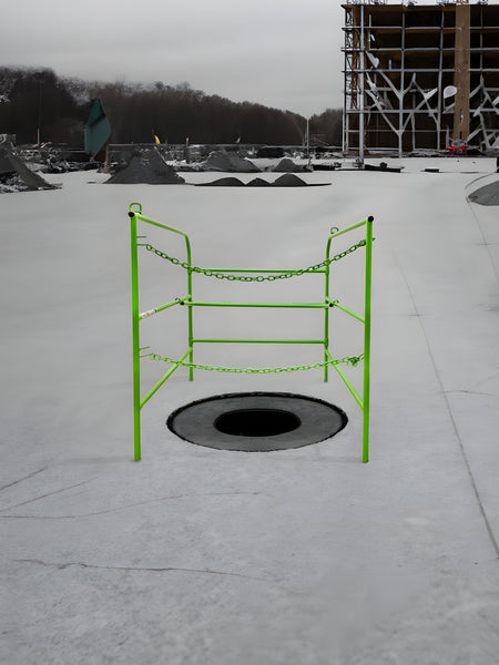 Available in two size options, the guardrail system provides ample room for safe entry and movement around the manhole. Its collapsible design makes it easy to store and transport between jobs, while the powder-coated safety green or safety yellow finish enhances visibility in busy work environments.