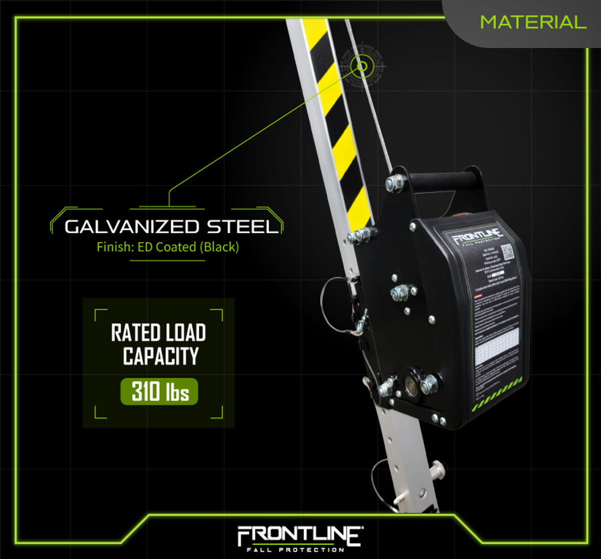 Designed for use with the Frontline MEGApod Tripod, this winch includes a mounting plate with dual locking bolts for secure attachment. It features a 60' galvanized steel cable, built-in shock absorption, and a swiveling snaphook for improved connection flexibility and user mobility.