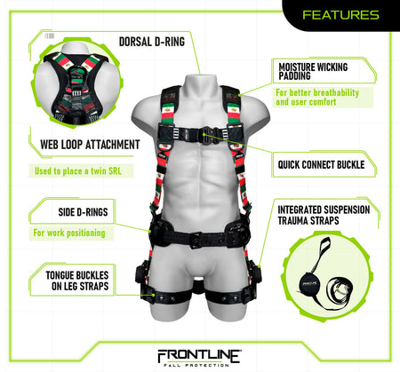 The 110CTB-MX Combat™ Full Body Harness from Frontline adds bold design to industry-standard safety with its vibrant Mexican-style graphics, all while delivering rugged performance and full compliance. Made entirely with lightweight aluminum hardware, this harness provides superior comfort and mobility for high-exposure job sites.