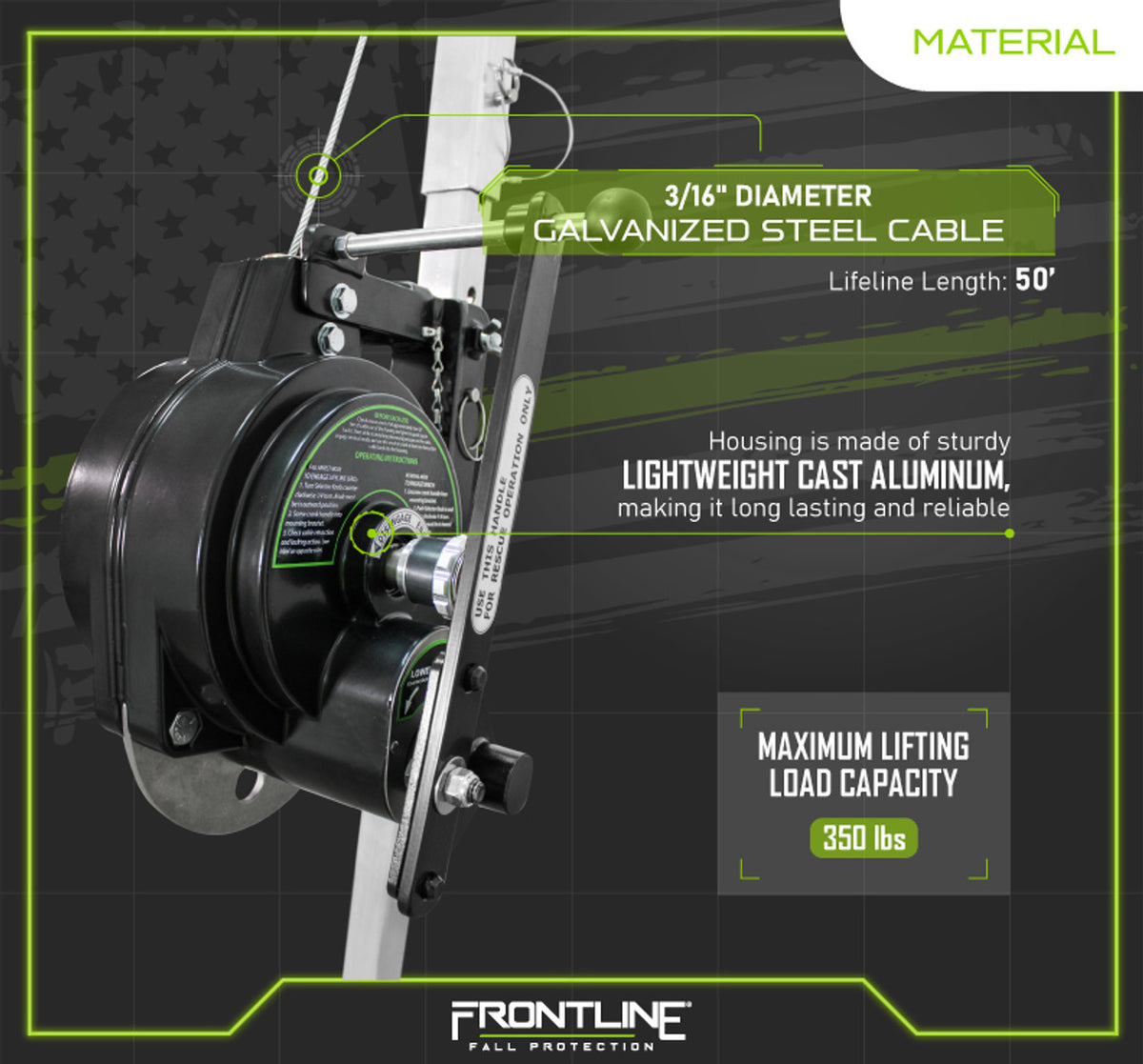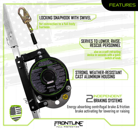 The Frontline RAG503W-US Patriot™ 3-Way Retrieval & SRL is a top-tier confined space solution proudly made in the USA. Designed for reliability in the most demanding environments, this system combines rescue, lifting, lowering, and fall arrest capabilities in a single rugged device—ideal for use with the Patriot™ Tripod, Davit, or Quadpod systems.
