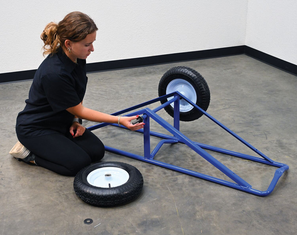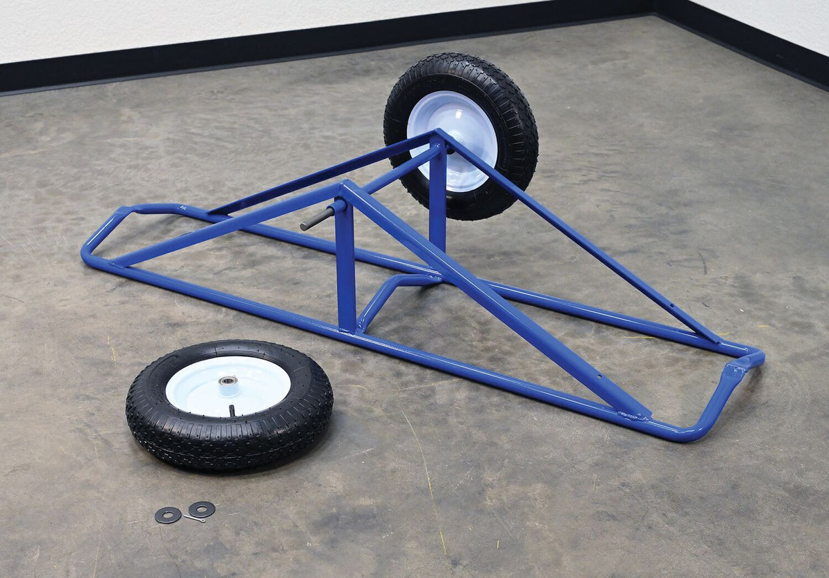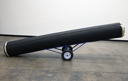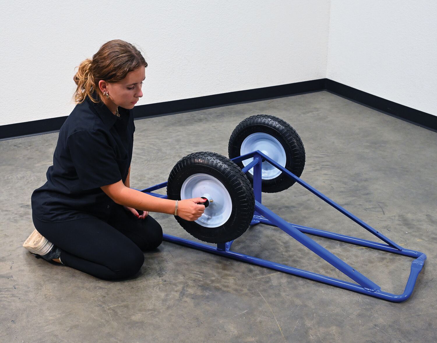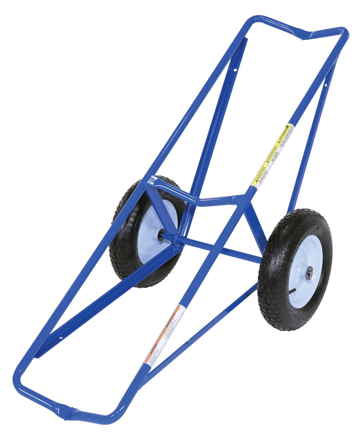 This portable carpet dolly allows for the easy movement of long and heavy rolls of carpeting. The V-groove platform securely holds carpet rolls in place, while oversized pneumatic wheels make maneuvering smooth and simple. Built from welded steel with a durable powder coat blue finish, this dolly is designed for long-lasting, rugged use.