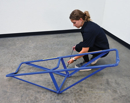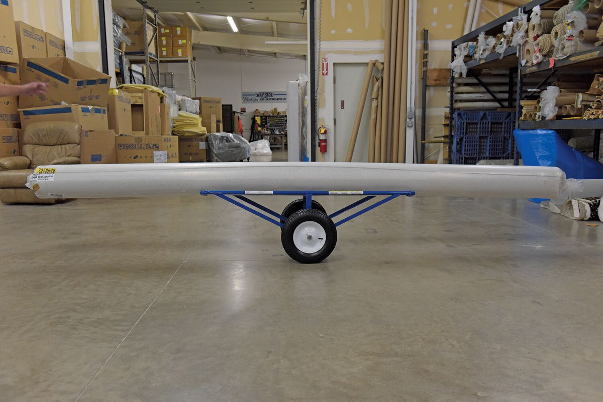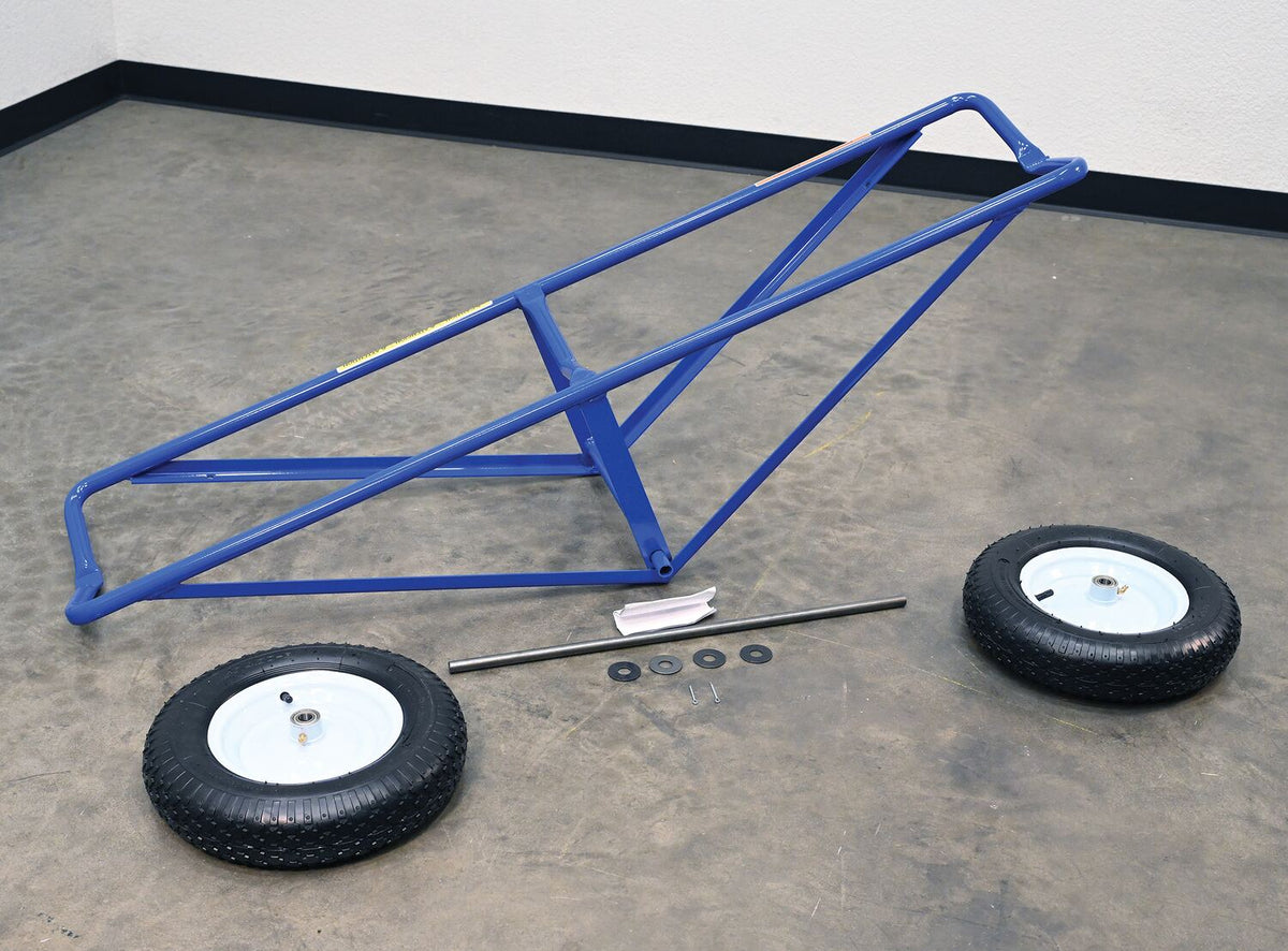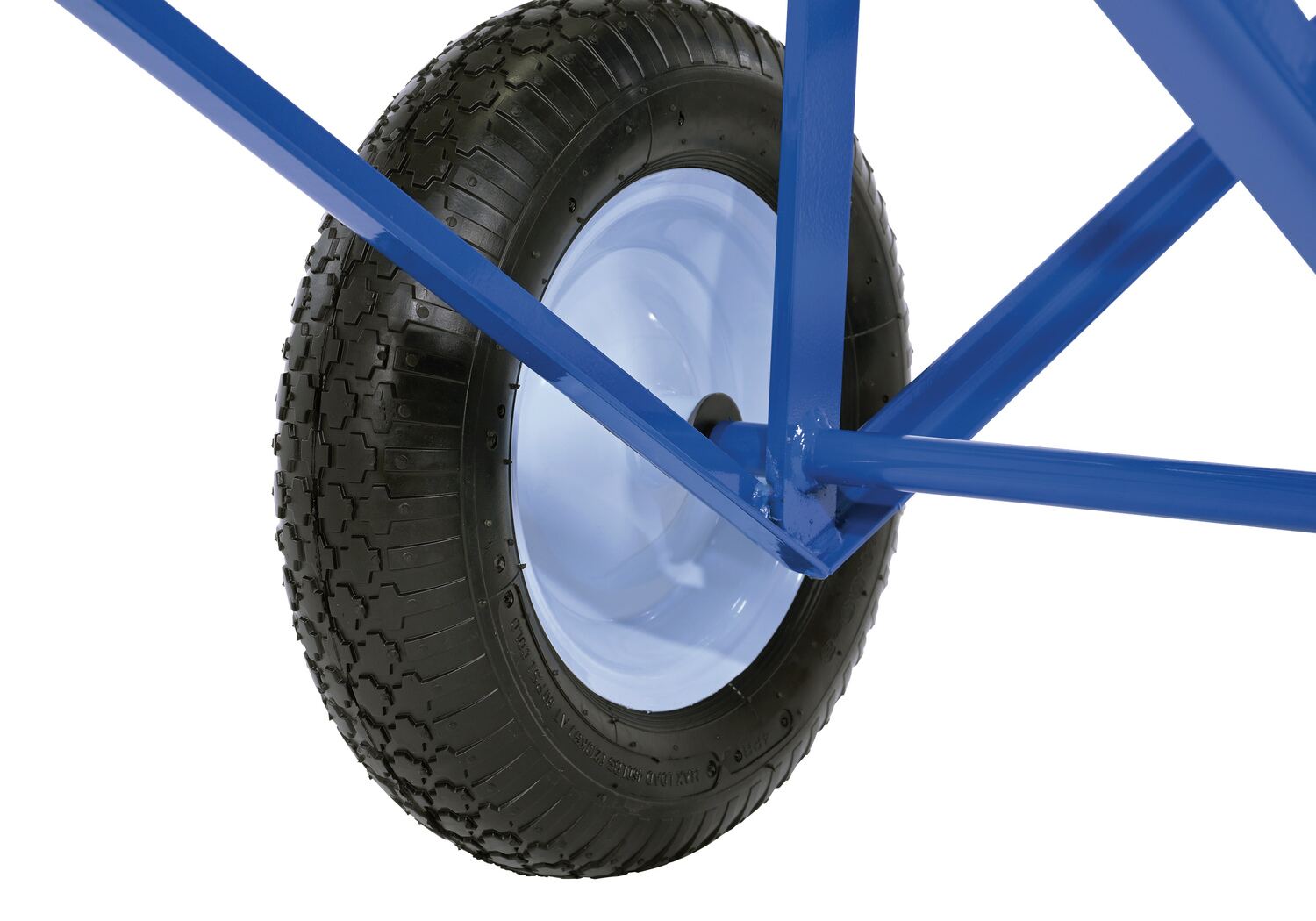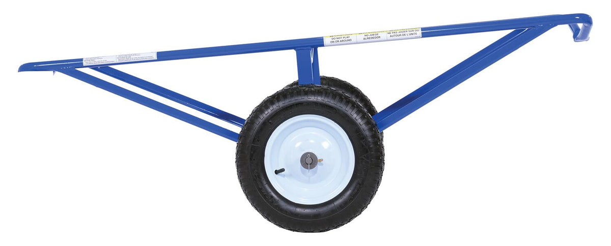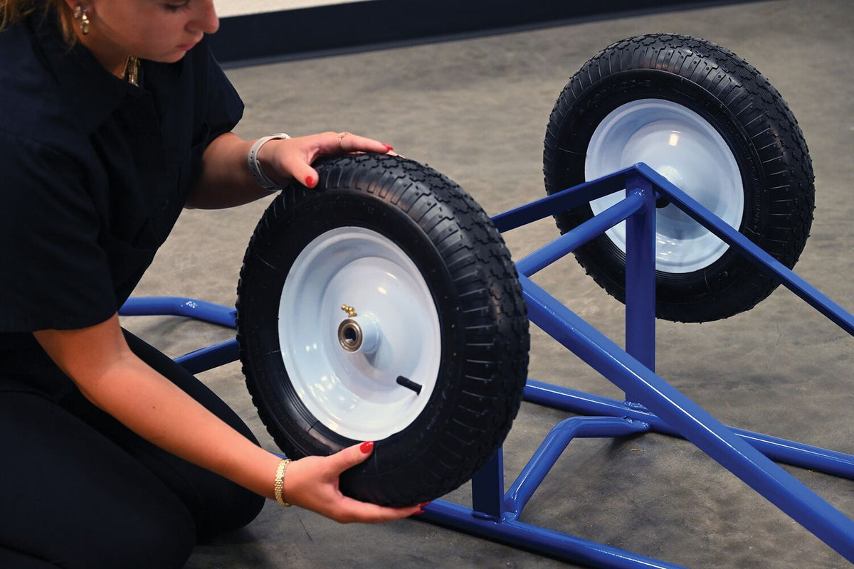 This portable carpet dolly allows for the easy movement of long and heavy rolls of carpeting. The V-groove platform securely holds carpet rolls in place, while oversized pneumatic wheels make maneuvering smooth and simple. Built from welded steel with a durable powder coat blue finish, this dolly is designed for long-lasting, rugged use.