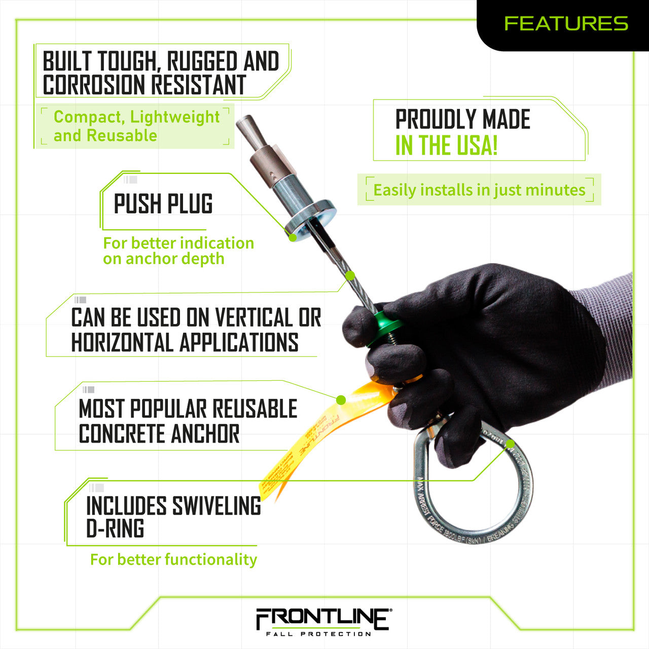 The Frontline Reusable 5K Concrete Anchor Bolt with Swiveling D-Ring is a lightweight, compact anchorage solution designed for fast, secure installation in concrete. Featuring a 360° swiveling D-ring, this anchor allows greater user mobility while helping prevent side loading or accidental disengagement.