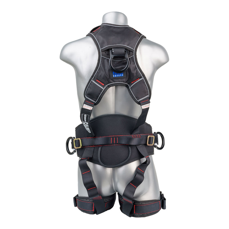 Black top. Black padding. 5 point FBH. QCB all aluminum hardware. Padded back sewn in. Padded legs sewn in. Positioning belt black. 1 Back D-ring. 2 Hip D-rings. 2 Front D-rings. Multiple sizes. SRL back plate. Meets or Exceeds ANSI Z359.11-2014. A10.32-2012.
