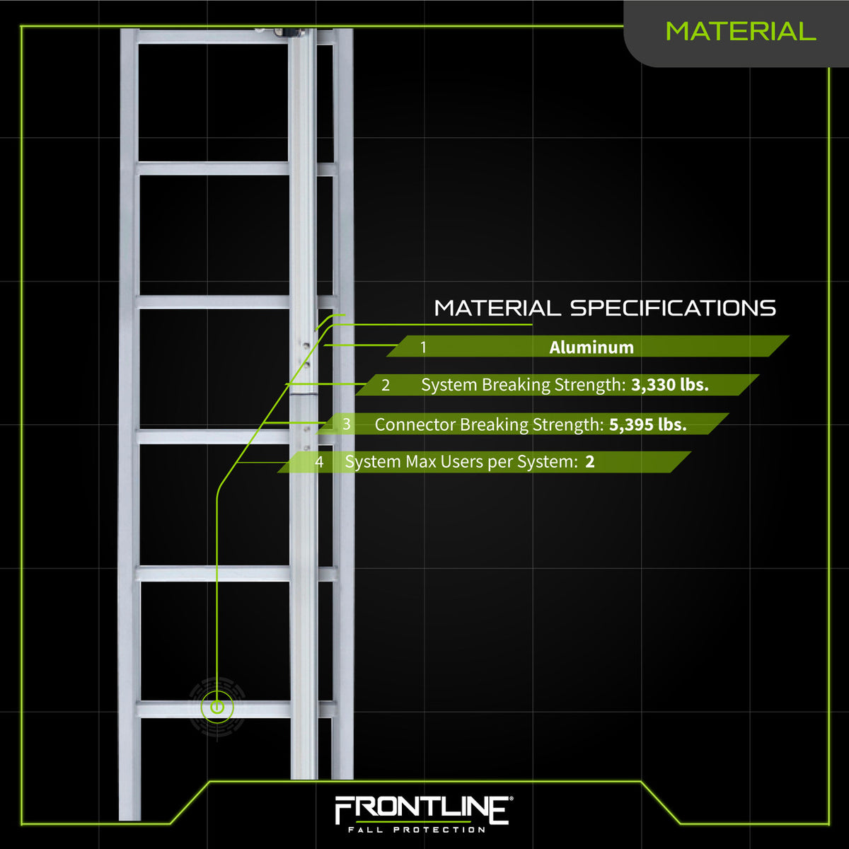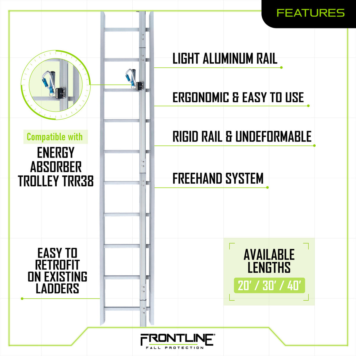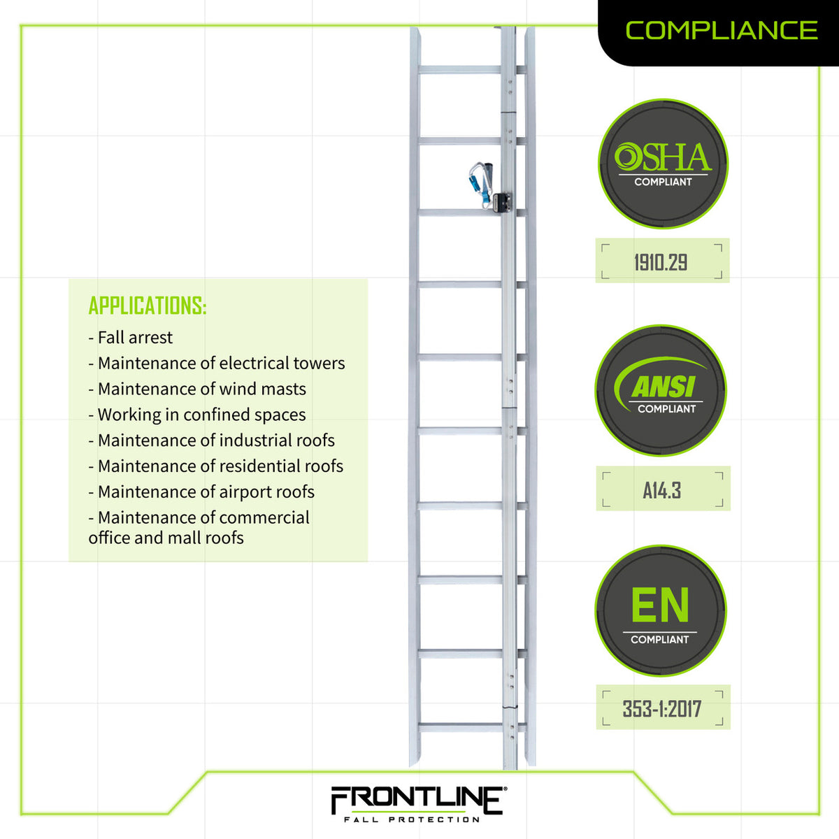The Frontline Securail Pro Vertical Lifeline System is a rigid, high-performance fall arrest solution designed for vertical access on fixed ladders. Engineered from lightweight aluminum and equipped with undeformable stainless steel mounting brackets, this system provides superior security over traditional safety hoops and is ideal for rooftops, pylons, wind masts, and confined spaces.