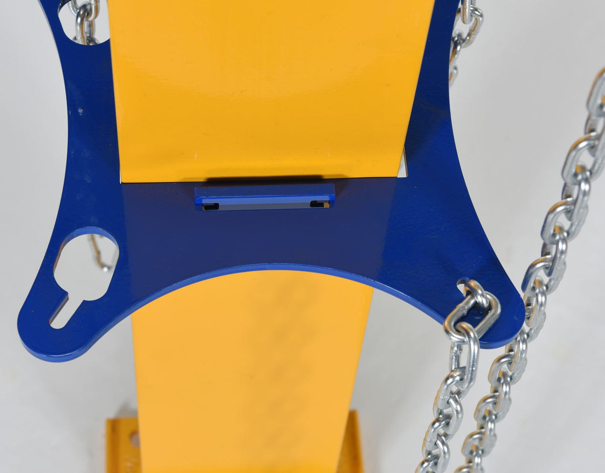 The Vestil SACR-2 Steel Cylinder Storage Stand provides secure upright storage for up to two cylinders. Constructed from heavy-duty steel with a yellow and blue finish, the stand features shaped steel supports and a safety chain to hold cylinders in position.