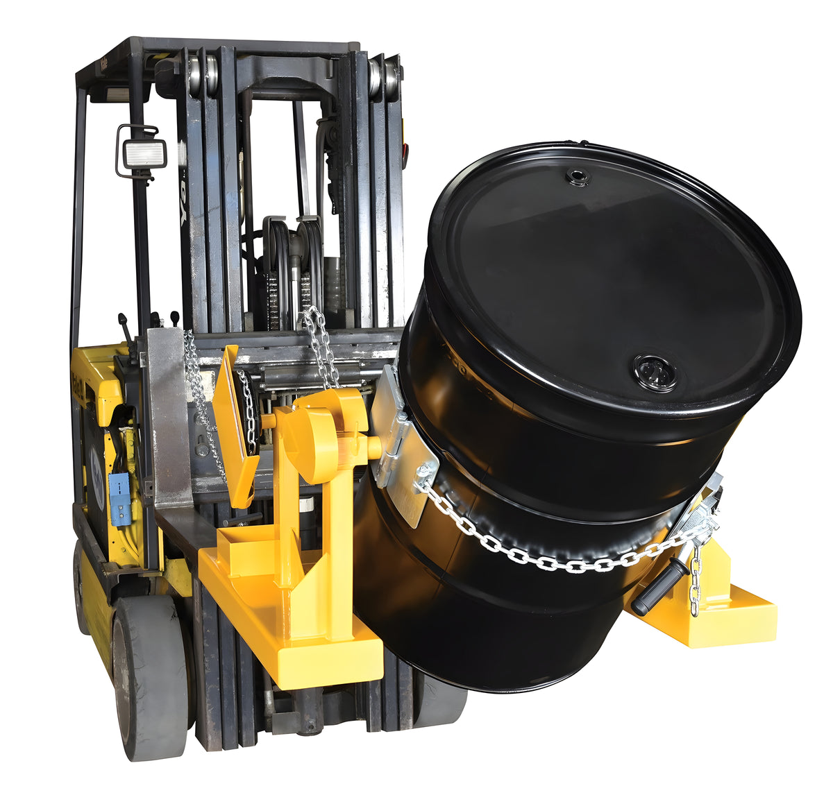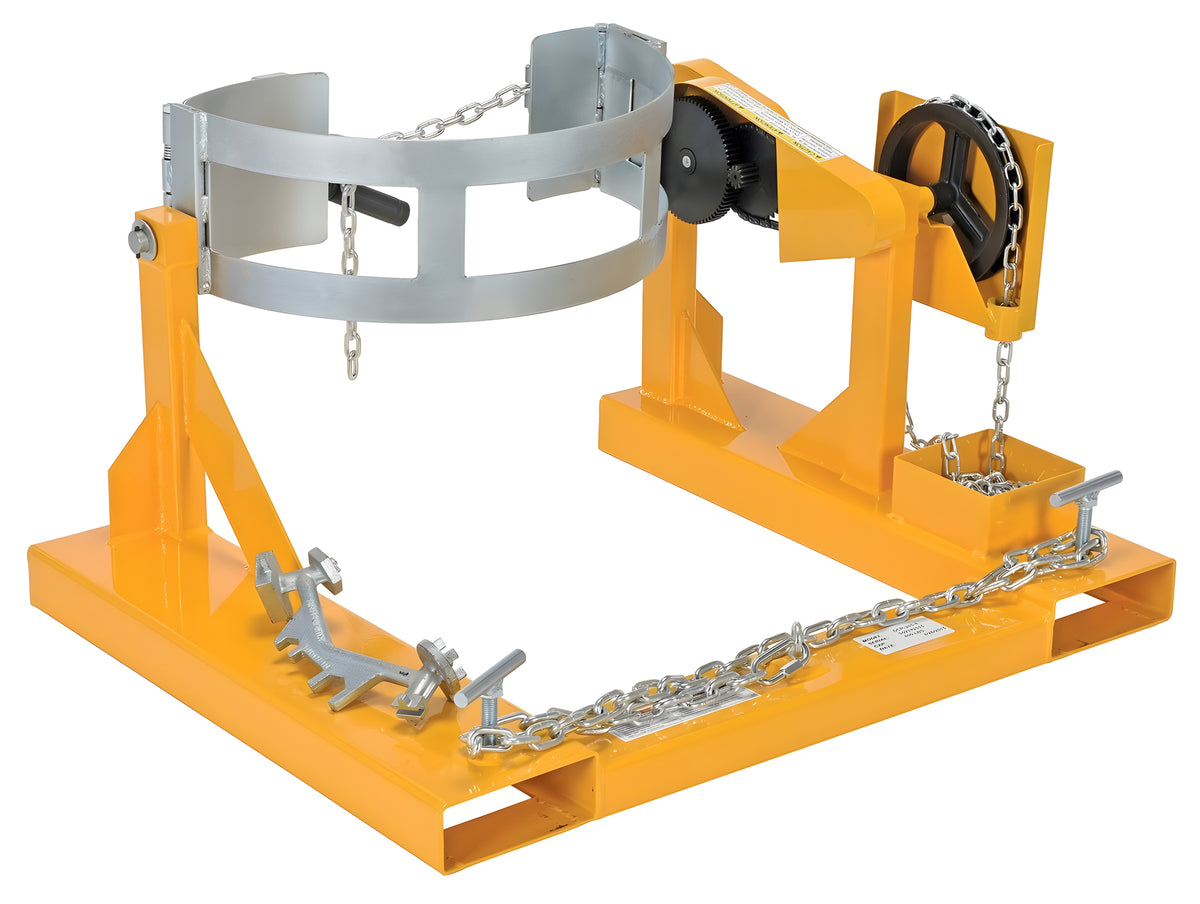 The Vestil Model DCR-205-8 Steel Fork Truck Drum Carrier/Rotator allows forklift operators to safely transport and rotate 55-gallon steel drums. Drums are held securely in place with a durable chain locking system, and a 15 ft. rotation chain enables drum rotation directly from the operator’s seat. The unit rotates drums a full 360°, includes a bung nut wrench, and complies with OSHA General Industry rule 1910.178 and ANSI B56.1 standards.
