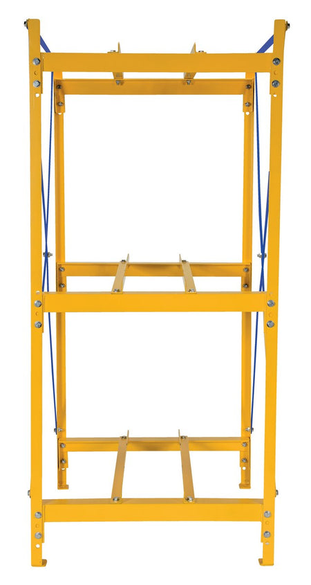 The Vestil Steel Horizontal Drum Storage Rack provides orderly and secure horizontal storage for (3) 30- or 55-gallon drums. Built with heavy-duty steel angle and reinforced with cross bracing for extra strength, the rack helps prevent accidental roll-off and keeps drums off the ground for a cleaner, safer work area. The design allows for simple draining from the nesting position and includes four anchor pads to help prevent tipping. Color is yellow with blue cross braces.