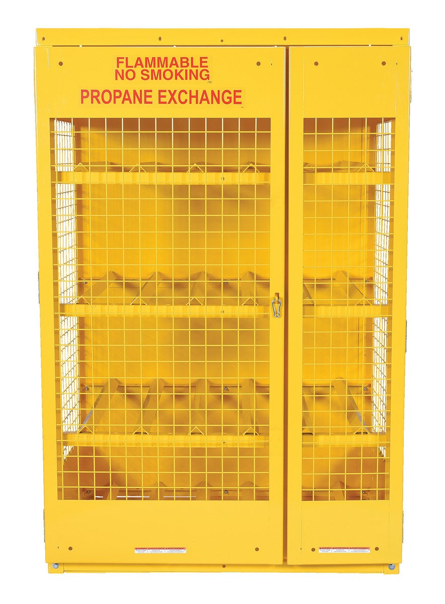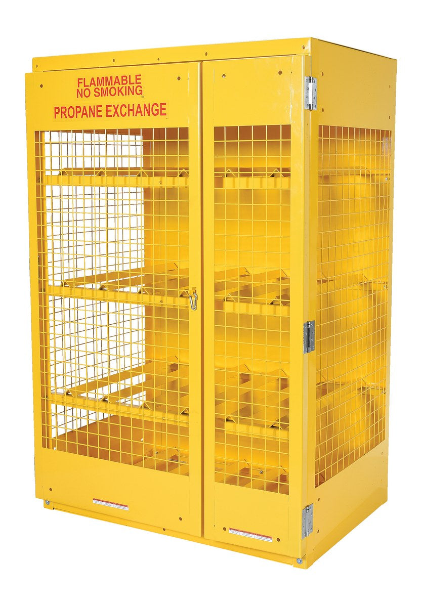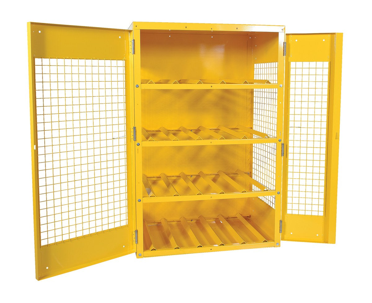 The Vestil CYL-H-12 Steel Horizontal Cylinder Cabinet is designed for the secure storage of up to 12 horizontal gas cylinders. Built with rugged steel construction, the cabinet features expanded steel mesh sides and door for visibility and ventilation, while the top, back, and bottom are solid sheet steel for added strength. A hinged, lockable door (padlock not included) and lag holes in the base provide enhanced safety and security. Finished in safety yellow with red “FLAMMABLE – NO SMOKING” signage, this cabinet complies with OSHA 1910.110 (f)(6)(ii), NFPA 55/58, and CSA B-149.2 standards.