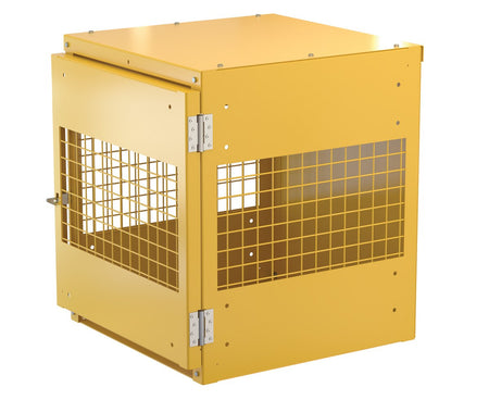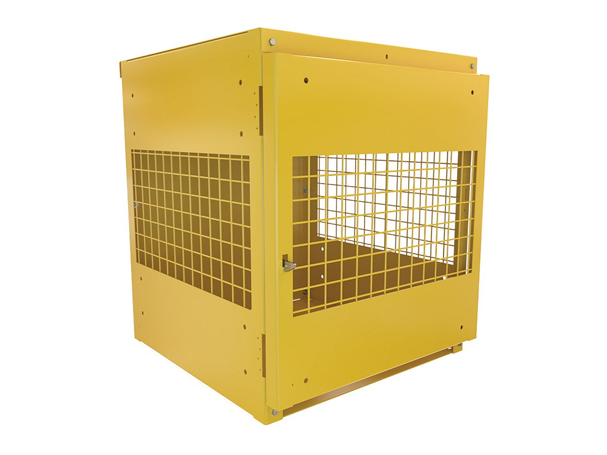 The Vestil CYL-V-4-KD Steel Knockdown Vertical Cylinder Cabinet provides secure and compliant storage for up to four vertical gas cylinders. Built from heavy-duty 10-gauge steel, the cabinet features expanded steel mesh sides and door for ventilation and visibility, with a solid top, back, and bottom for durability. The hinged lockable door (padlock not included) and included securing chains protect cylinders in place, while lag holes in the base allow the unit to be anchored for additional safety. Finished in safety yellow with bold “FLAMMABLE – NO SMOKING” signage, this cabinet complies with OSHA 1910.110 (f)(6)(ii), NFPA 55/58, and CGA P-1 standards. Ships knocked down for reduced freight cost and requires user assembly.