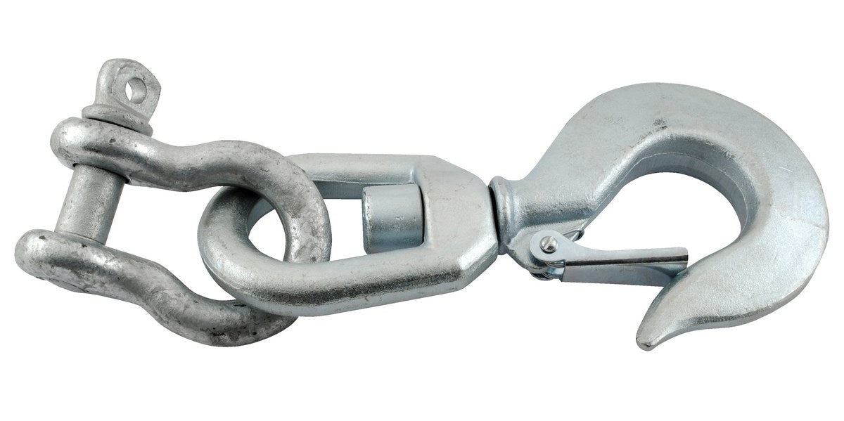 Easily connect to hoisting hooks, hook plates or booms using a swivel hook with shackle.