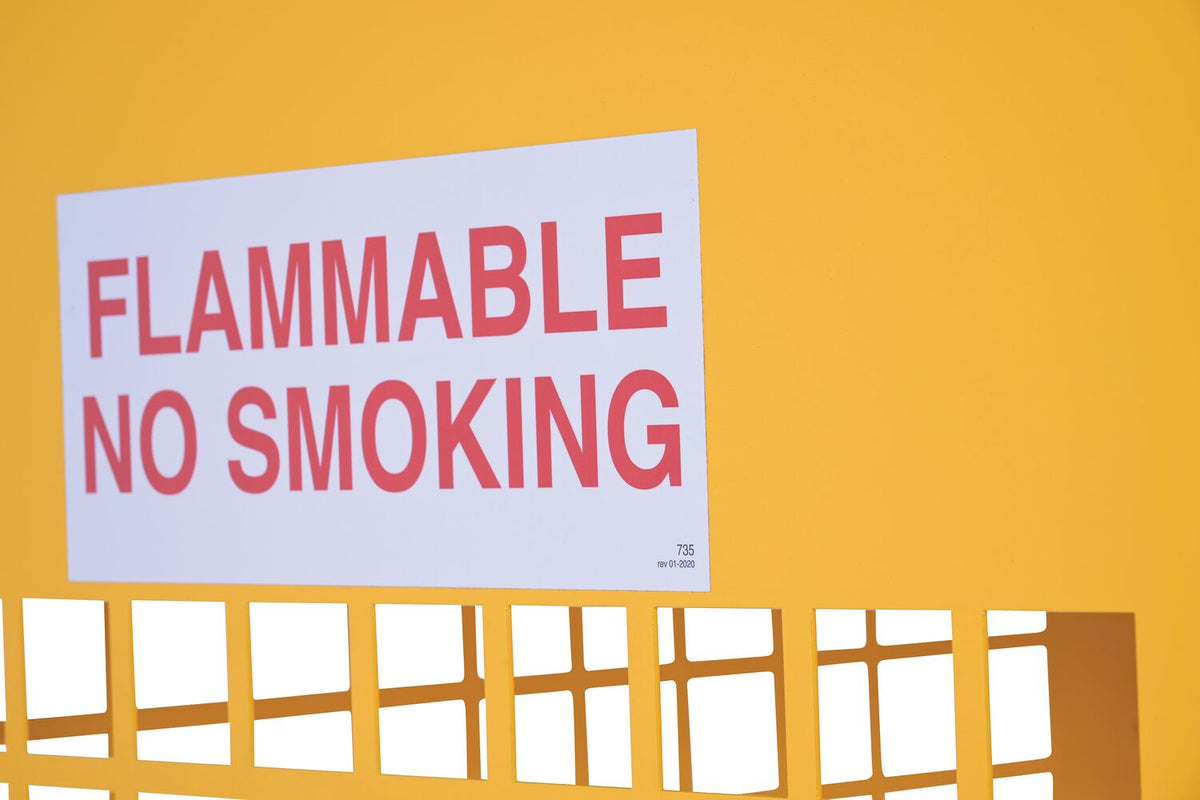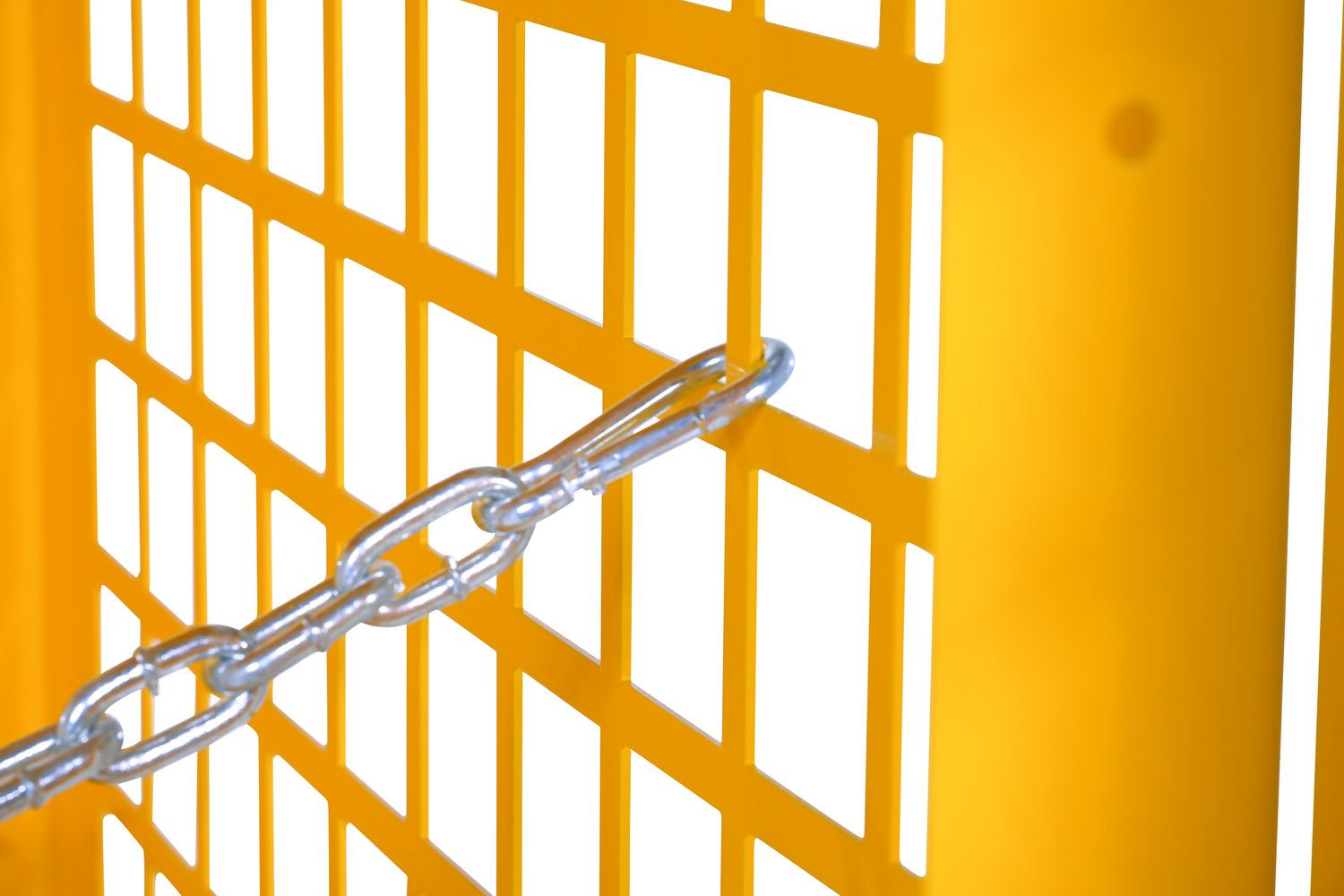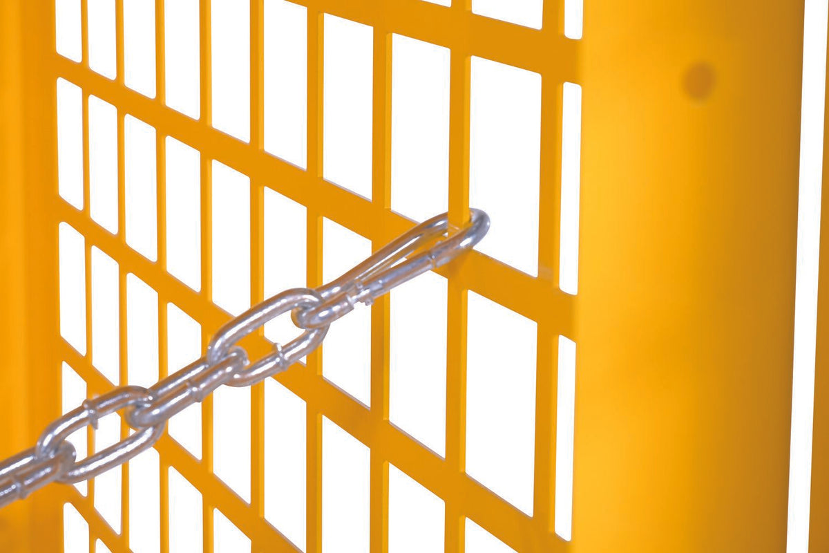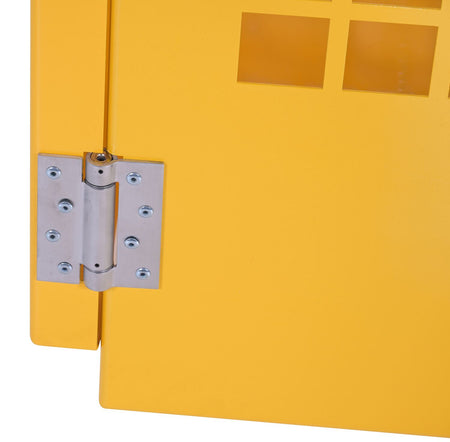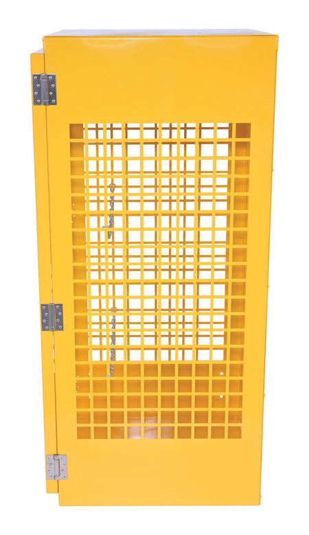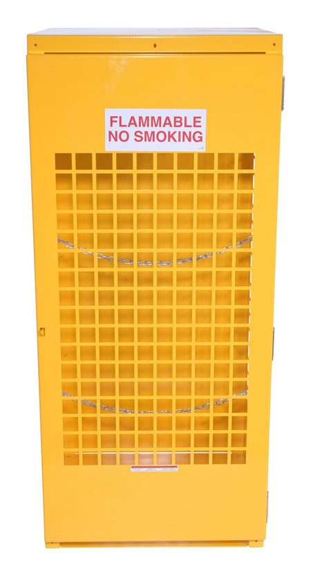 The Vestil CYL-V-510 Steel Vertical Cylinder Cabinet provides safe and compliant storage for up to ten gas cylinders, depending on size. Built from heavy-duty 10-gauge steel, the cabinet features expanded mesh sides and door for ventilation and visibility, with a solid top, back, and bottom for strength. The hinged lockable door (padlock not included) and included securing chains keep cylinders protected, while lag holes in the base allow the unit to be anchored for extra safety. Finished in safety yellow with bold “FLAMMABLE – NO SMOKING” signage, this cabinet complies with OSHA 1910.110 (f)(6)(ii), NFPA 55/58, and CGA P-1 standards.