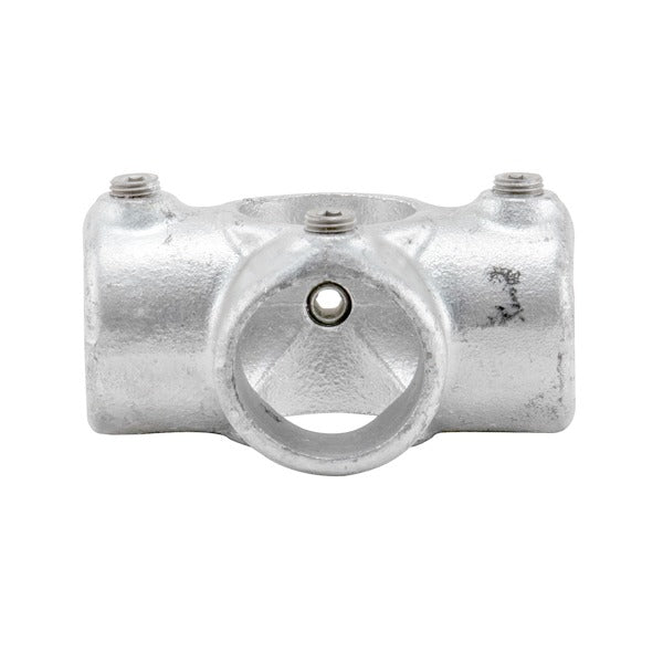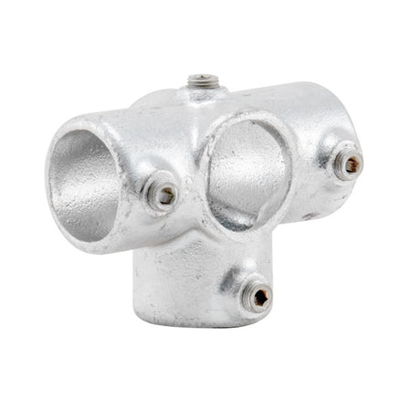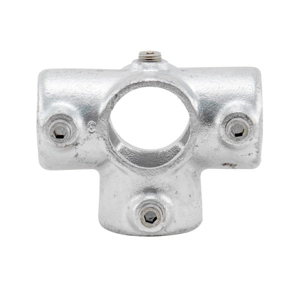The Easyfit Three Socket Cross (EF23G) connects three pipes at right angles to a single continuous pipe running through the fitting. This configuration is ideal for building racking systems, shelving, storage frames, and other pipe-based structures such as parkour equipment and garment racks.